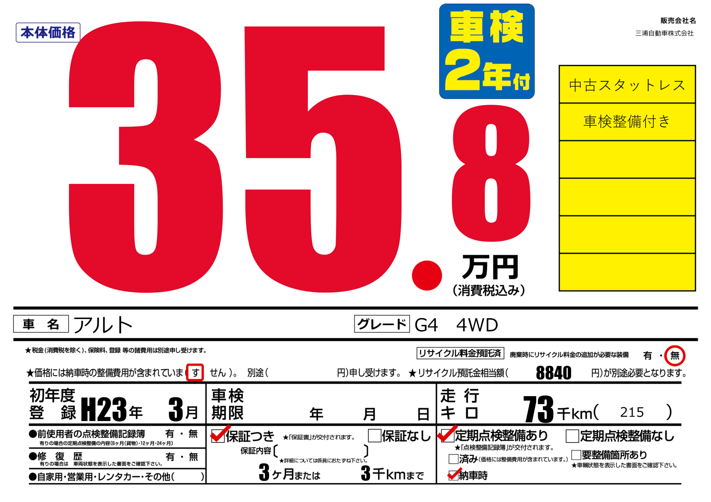 | 定期点検整備 | 定期点検整備あり 納車時あり | ||