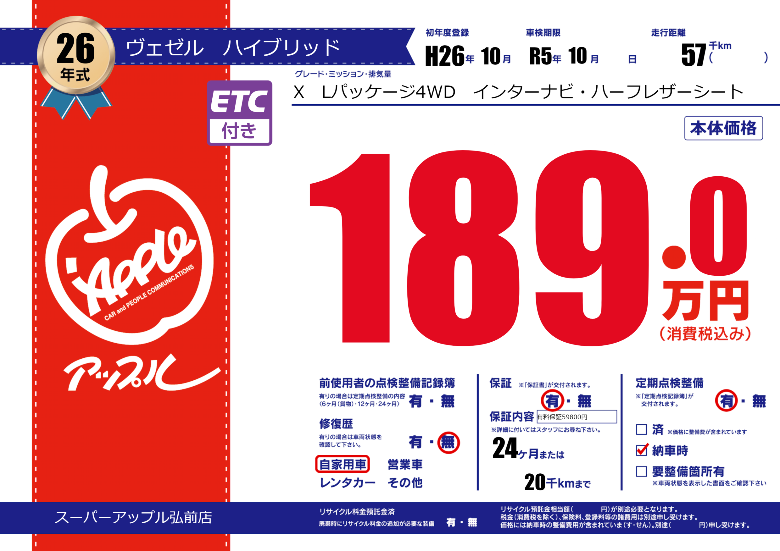 | 車名 | ヴェゼル ハイブリッド | グレード ミッション 排気量 |