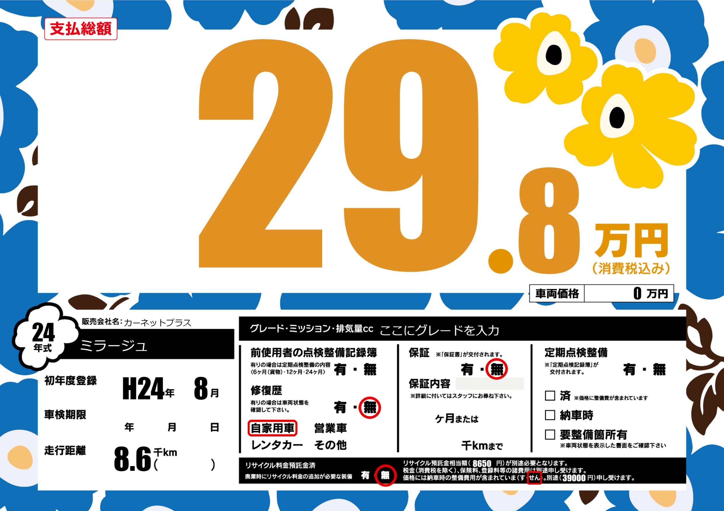 | 走行キロ | 0.8万km | 初年度登録 | H24年8月 |