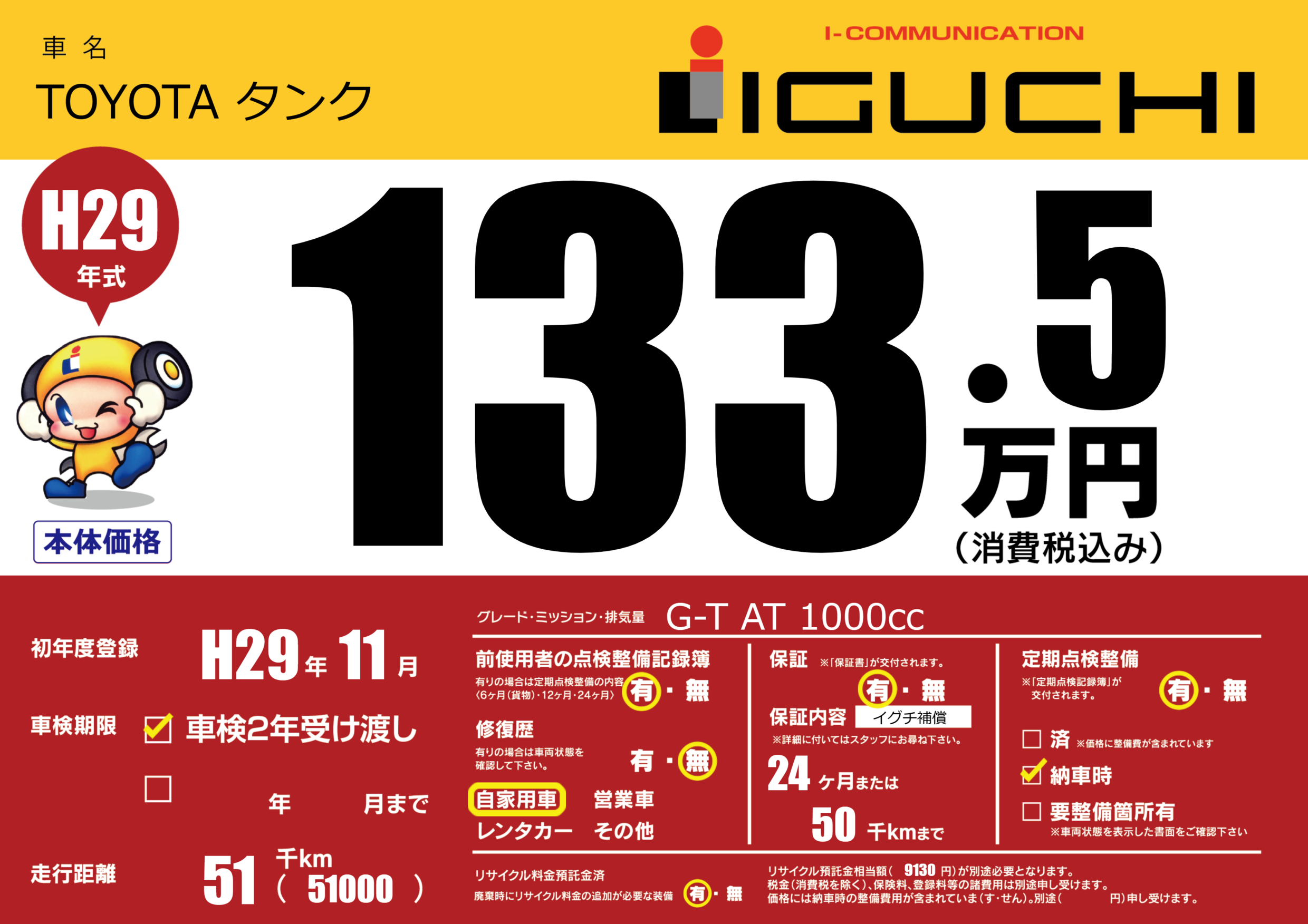 | 車名 | TOYOTA タンク | グレード ミッション 排気量 |