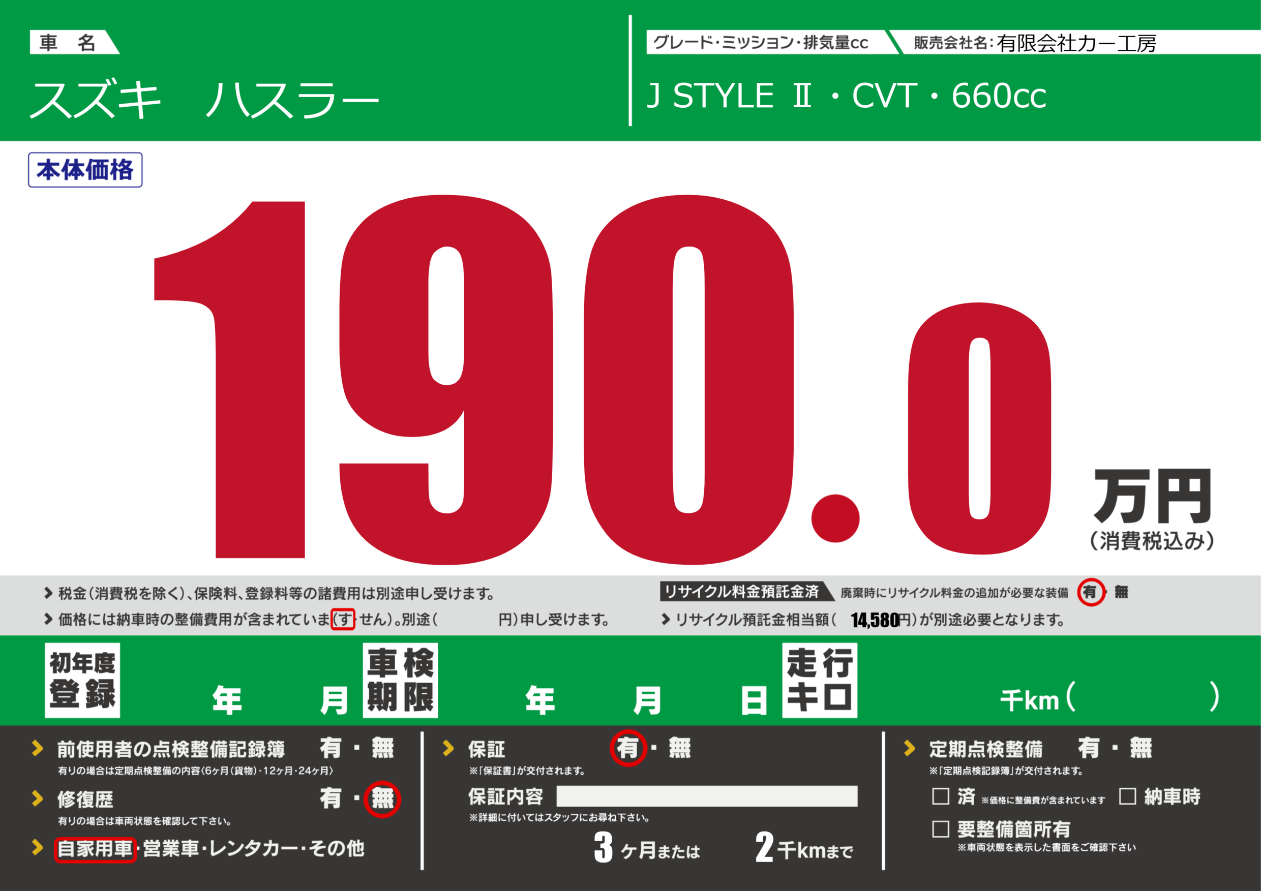 | 車名 | スズキ ハスラー | グレード ミッション 排気量 |