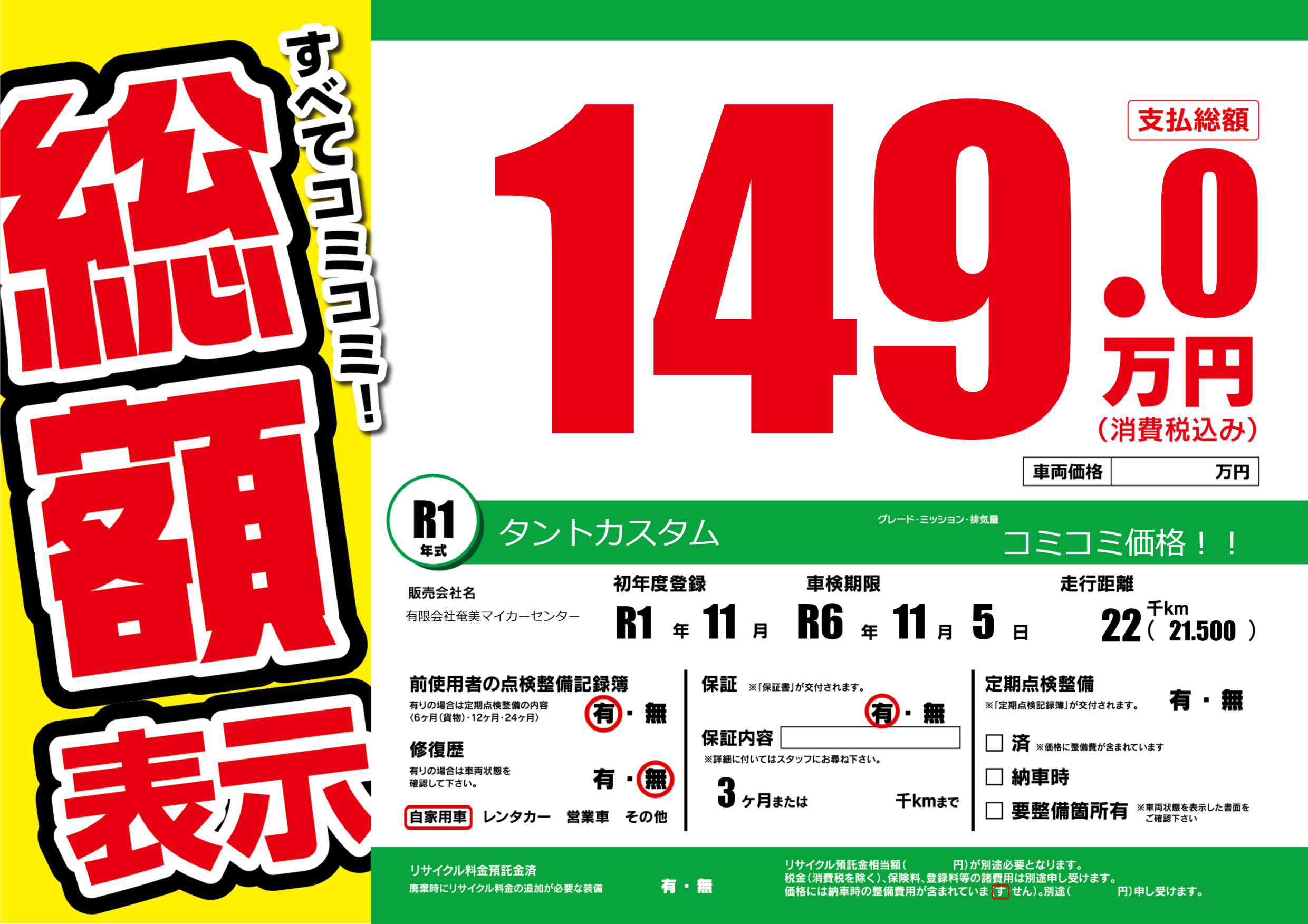| 走行キロ | 2.2万km | 初年度登録 | R1年11月 |
