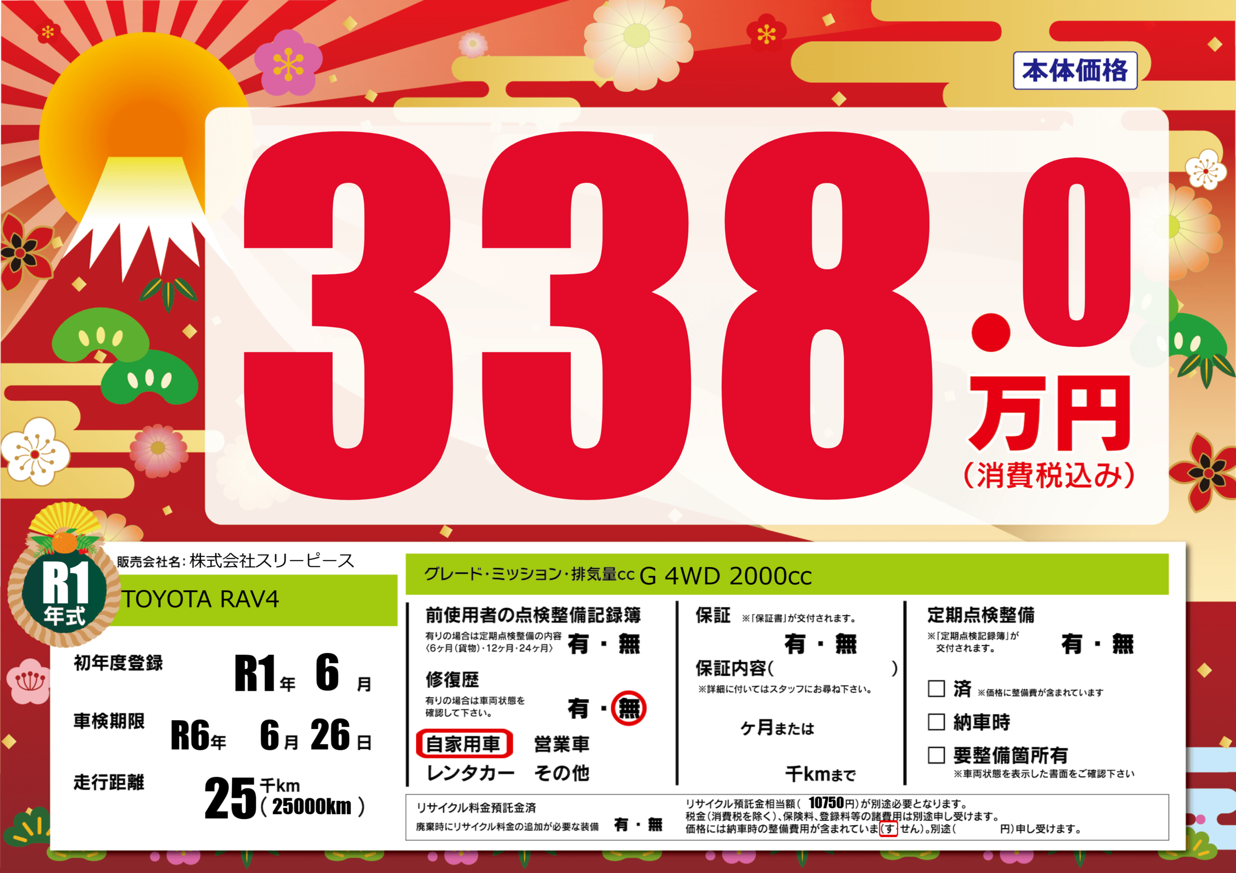 | 車名 | TOYOTA RAV4 | グレード ミッション 排気量 |