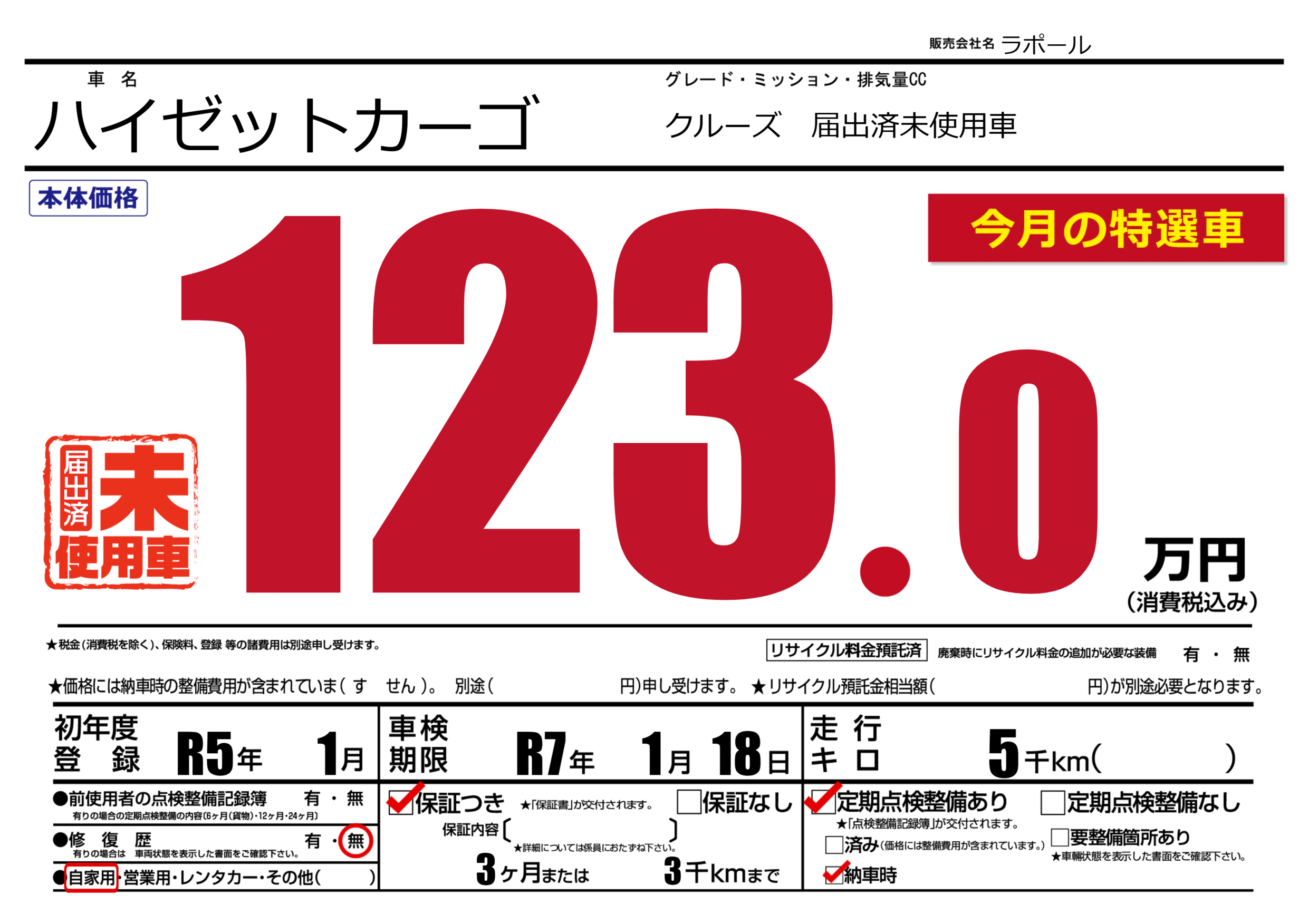 | 走行キロ | 0.5万km | 初年度登録 | R5年1月 |