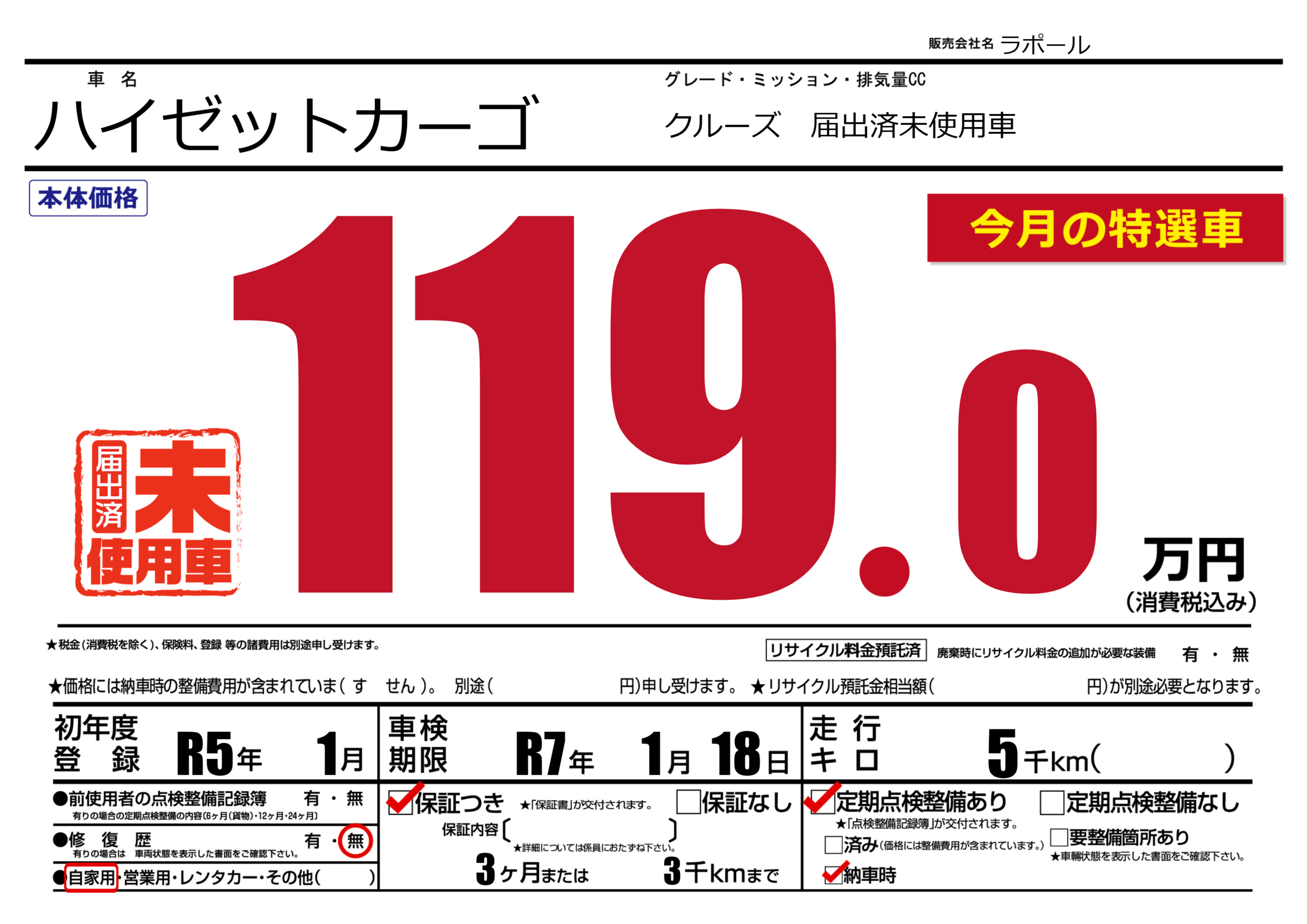 | 走行キロ | 0.5万km | 初年度登録 | R5年1月 |