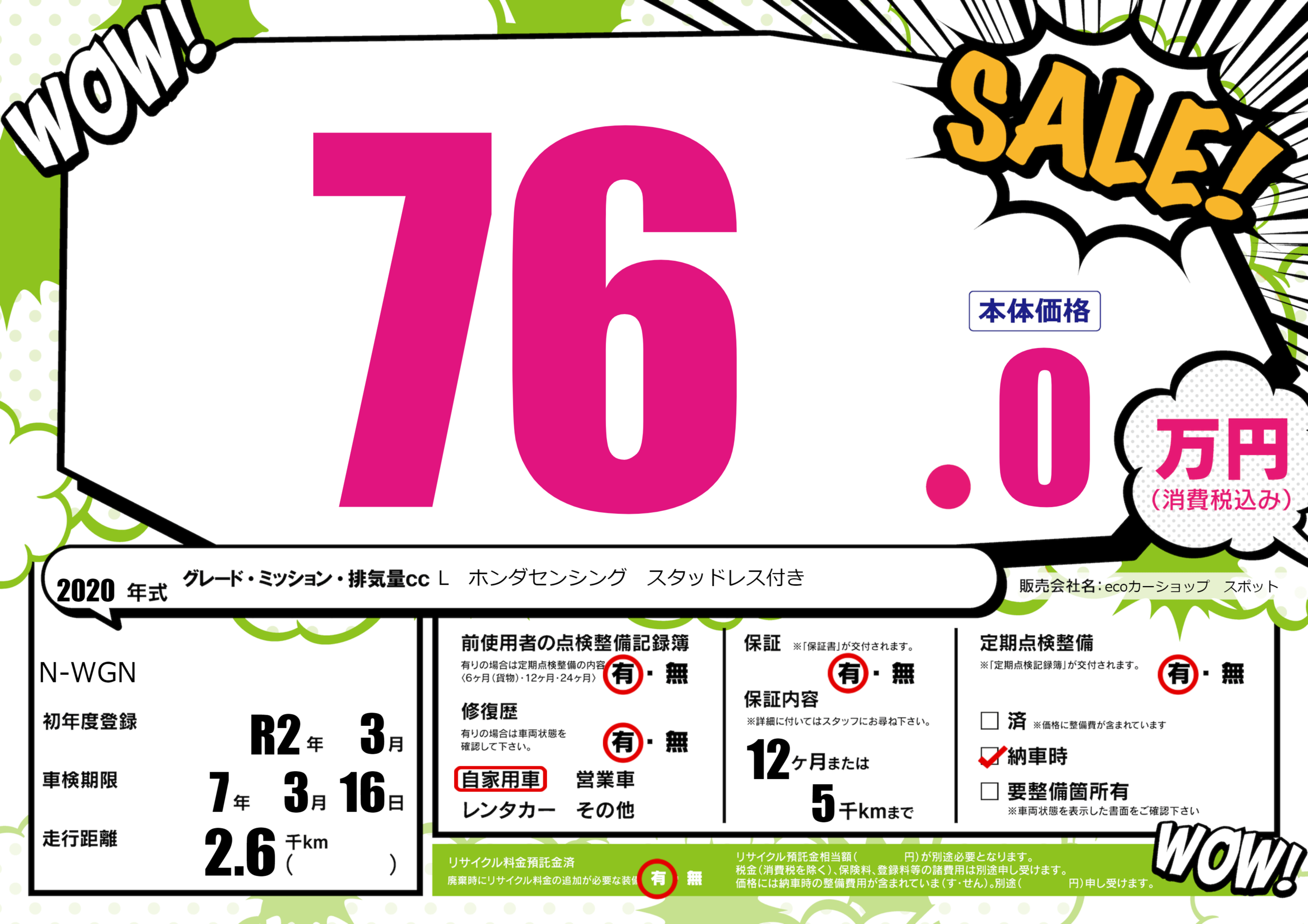 | 車名 | N-WGN | グレード ミッション 排気量 |
