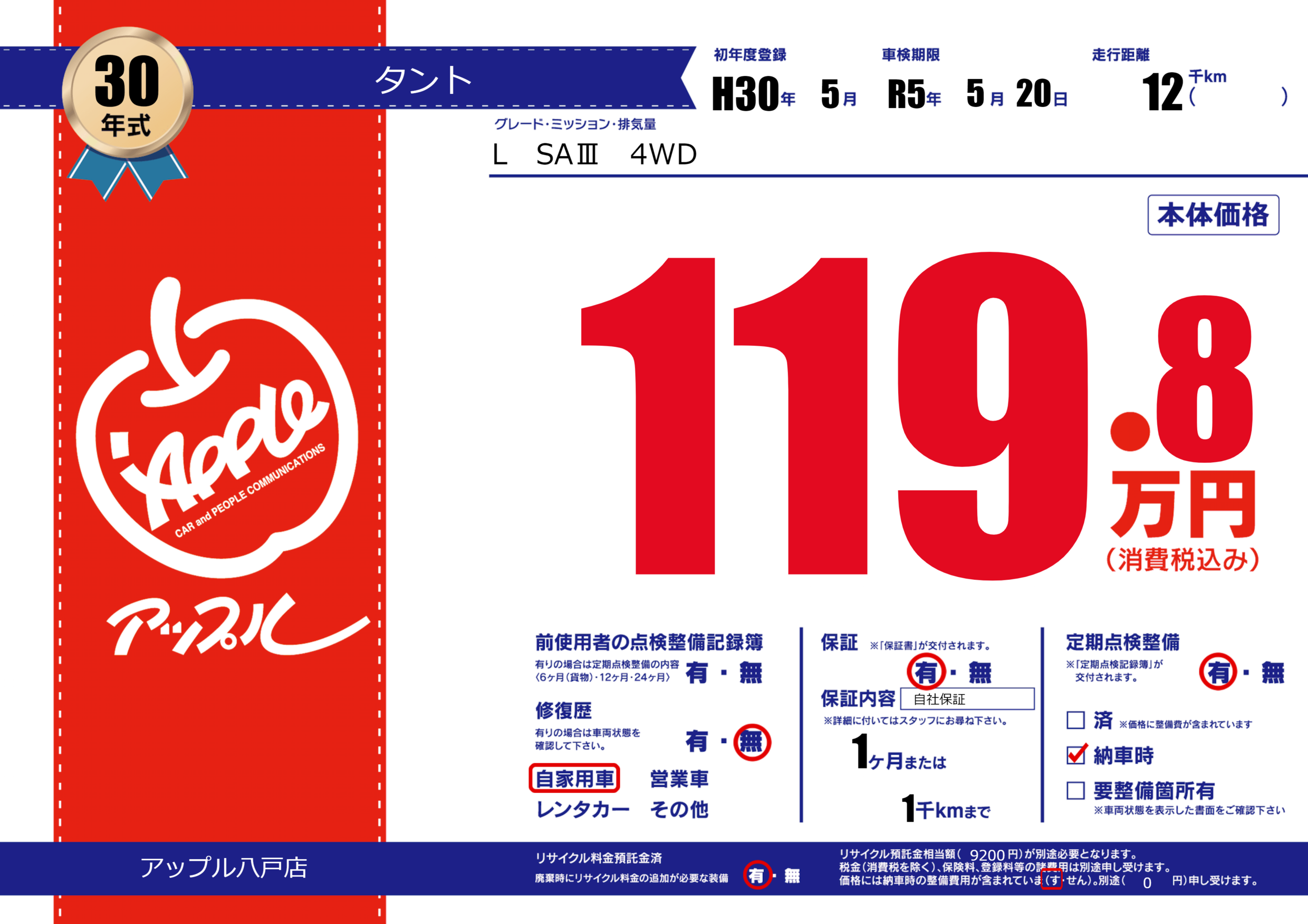 | 走行キロ | 1.2万km | 初年度登録 | H30年5月 |