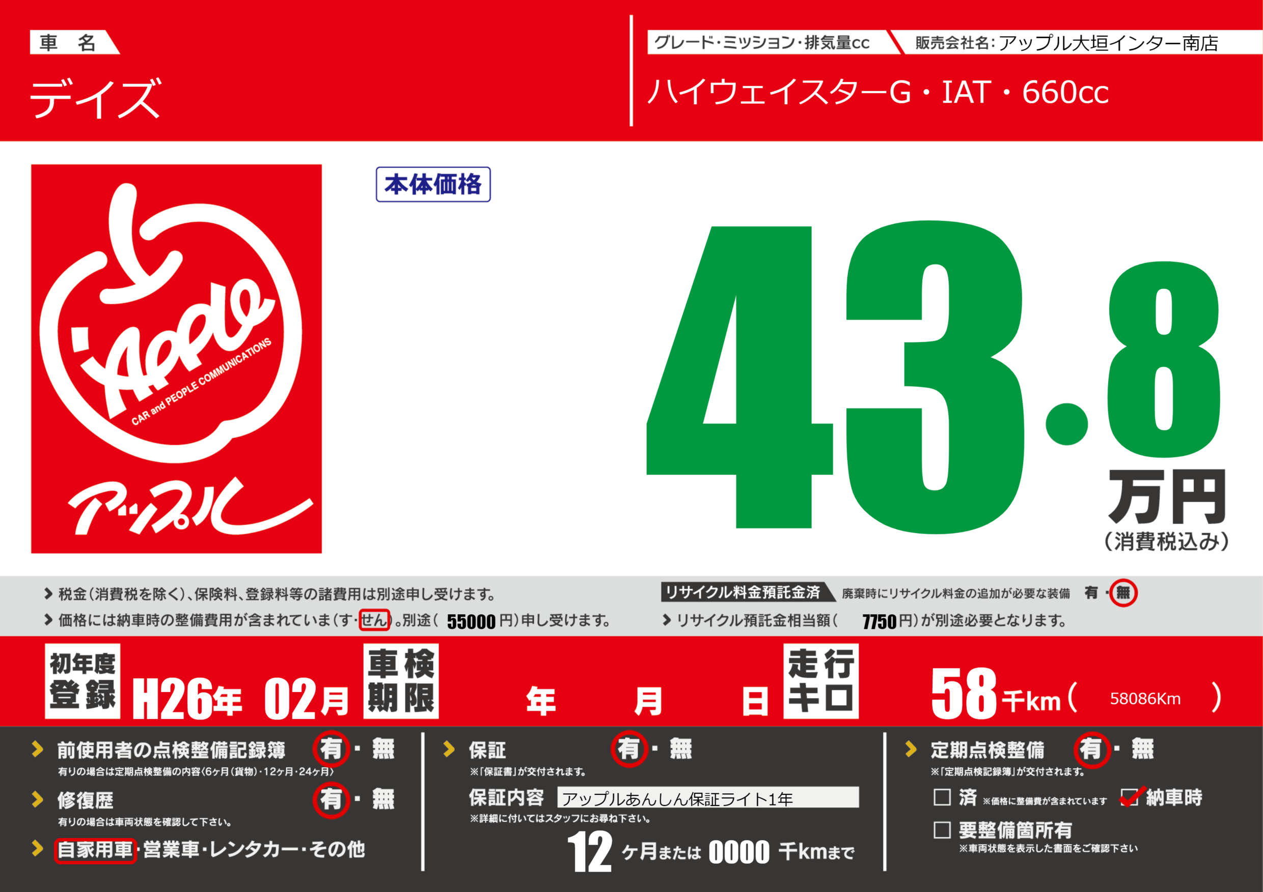 | 走行キロ | 5.8万km | 初年度登録 | H26年02月 |