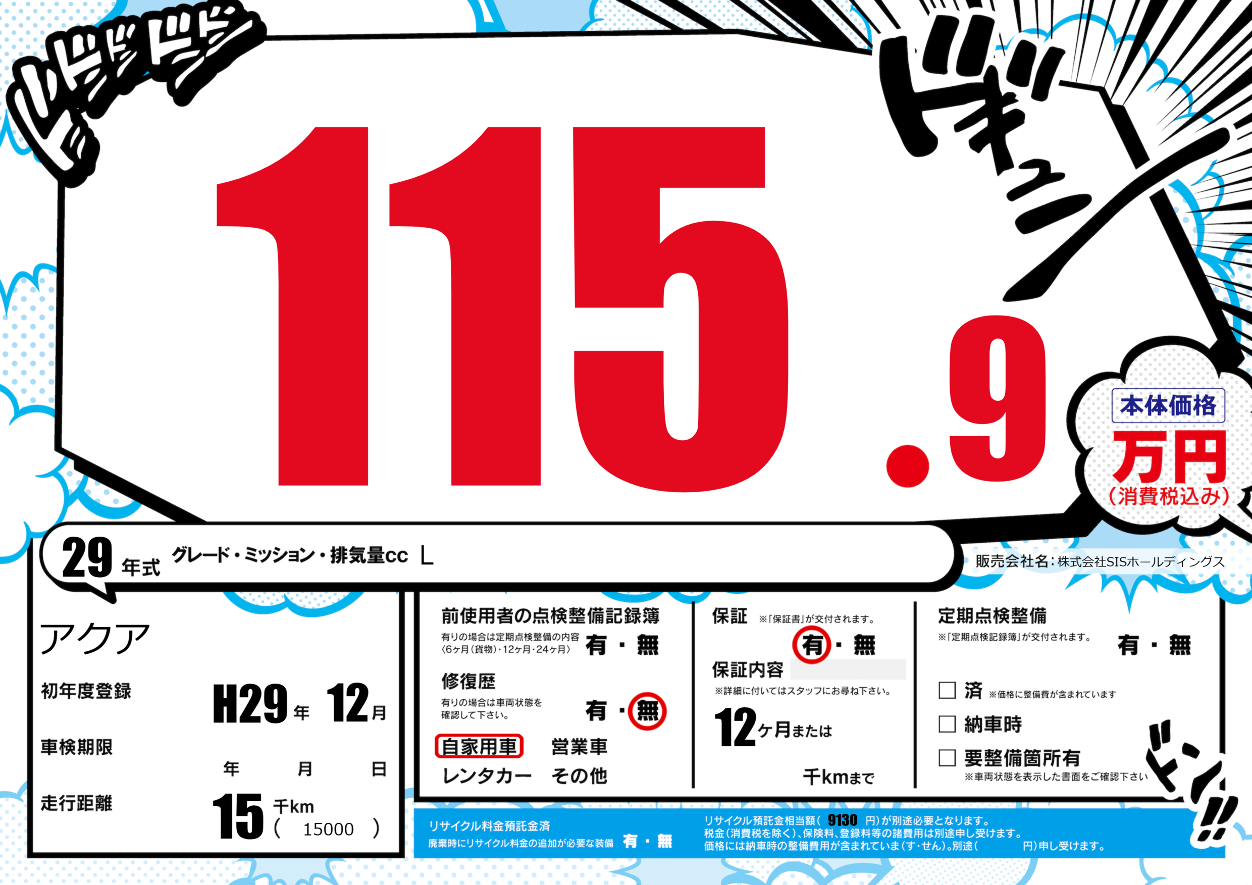 | 走行キロ | 1.5万km | 初年度登録 | H29年12月 |