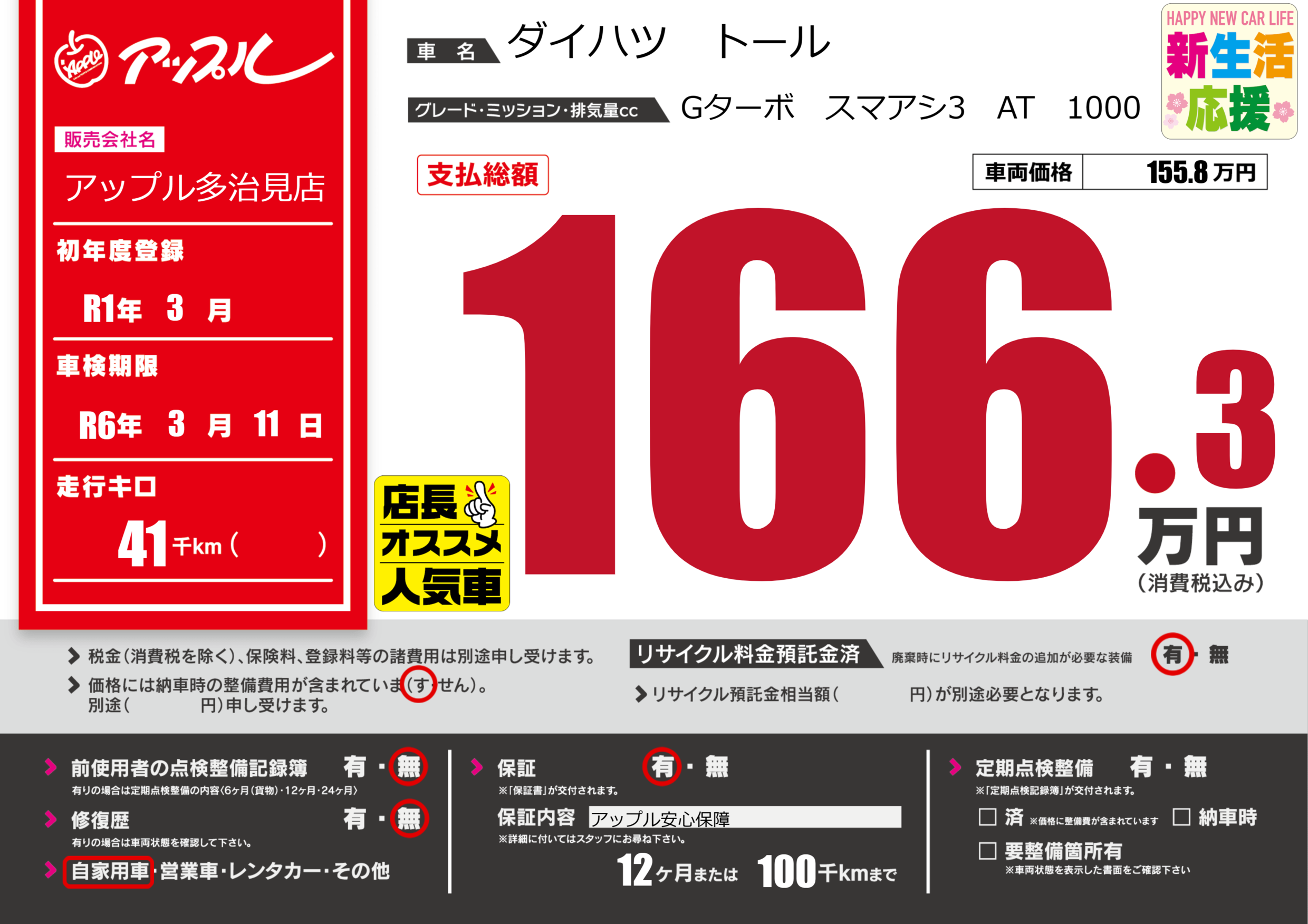 保証付き 保証内容(アップル安心保障) 12ヶ月または(100)千kmまで |