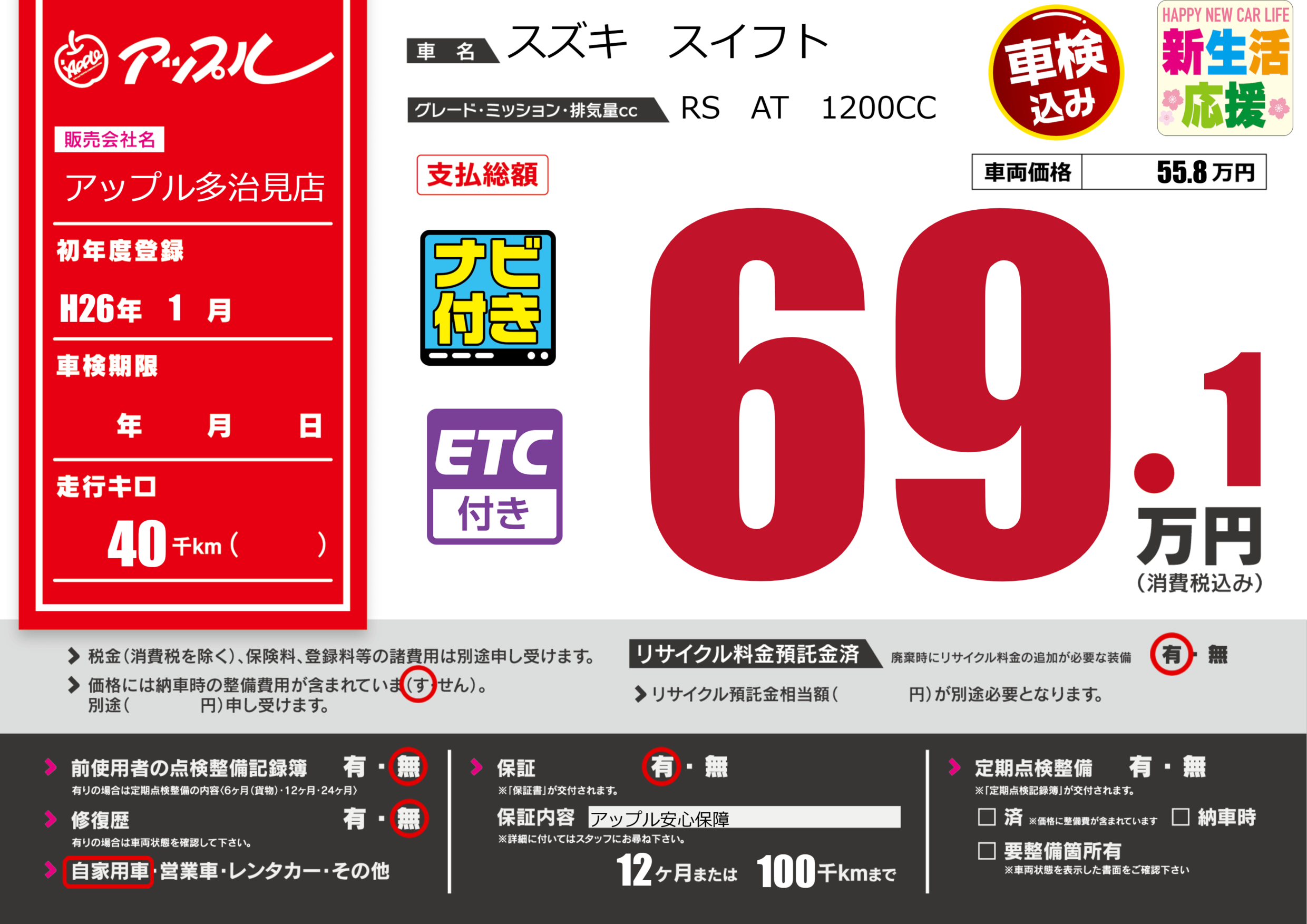 保証付き 保証内容(アップル安心保障) 12ヶ月または(100)千kmまで |