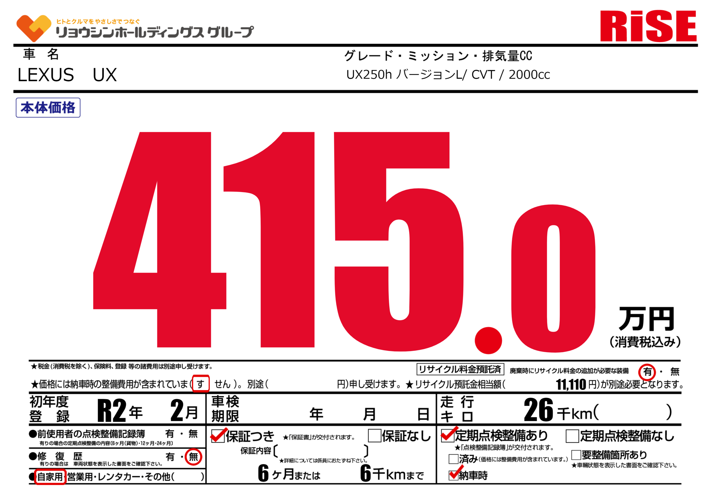 | 車名 | LEXUS UX | グレード ミッション 排気量 |