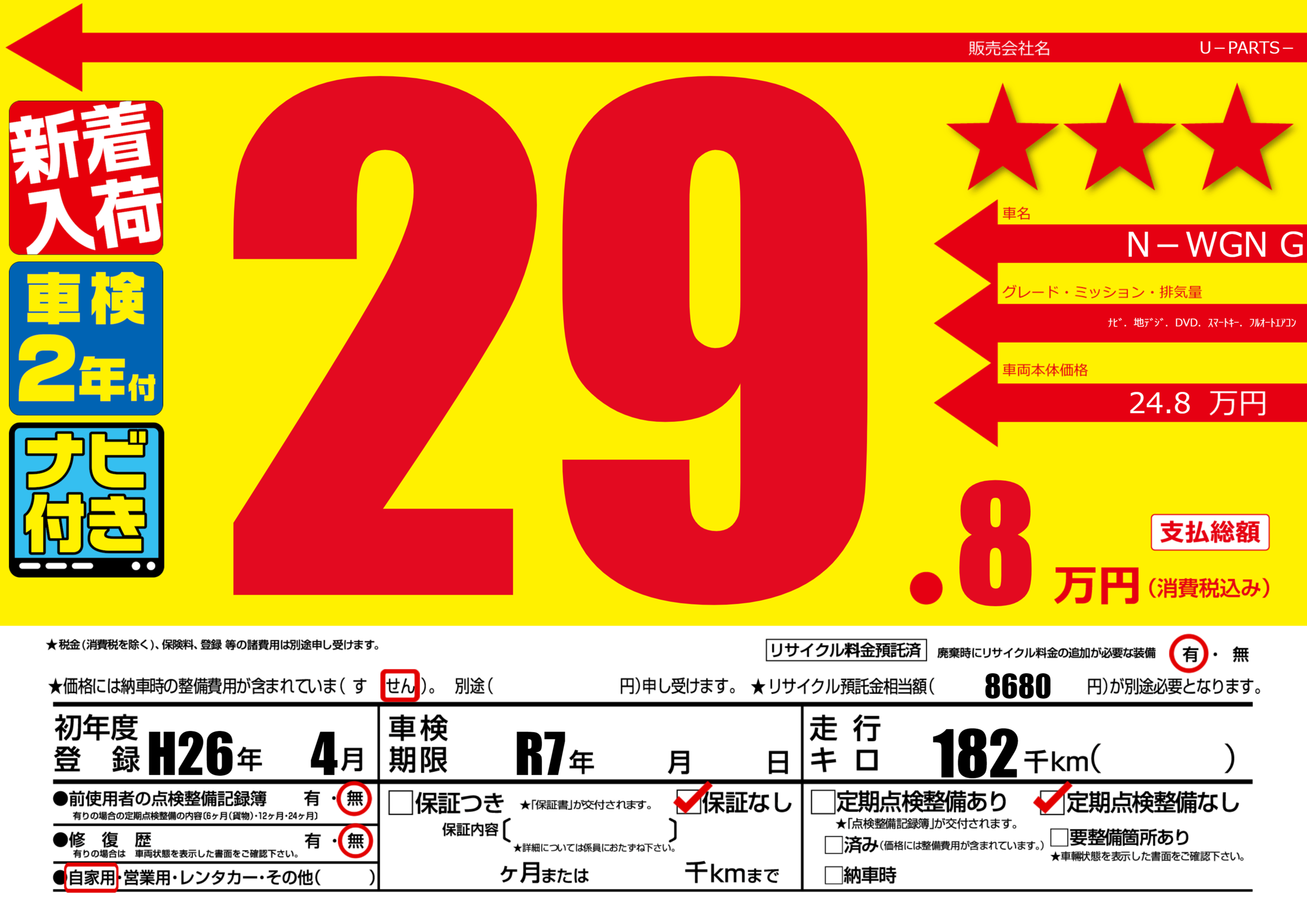 | 走行キロ | 18.2万km | 初年度登録 | H26年4月 |