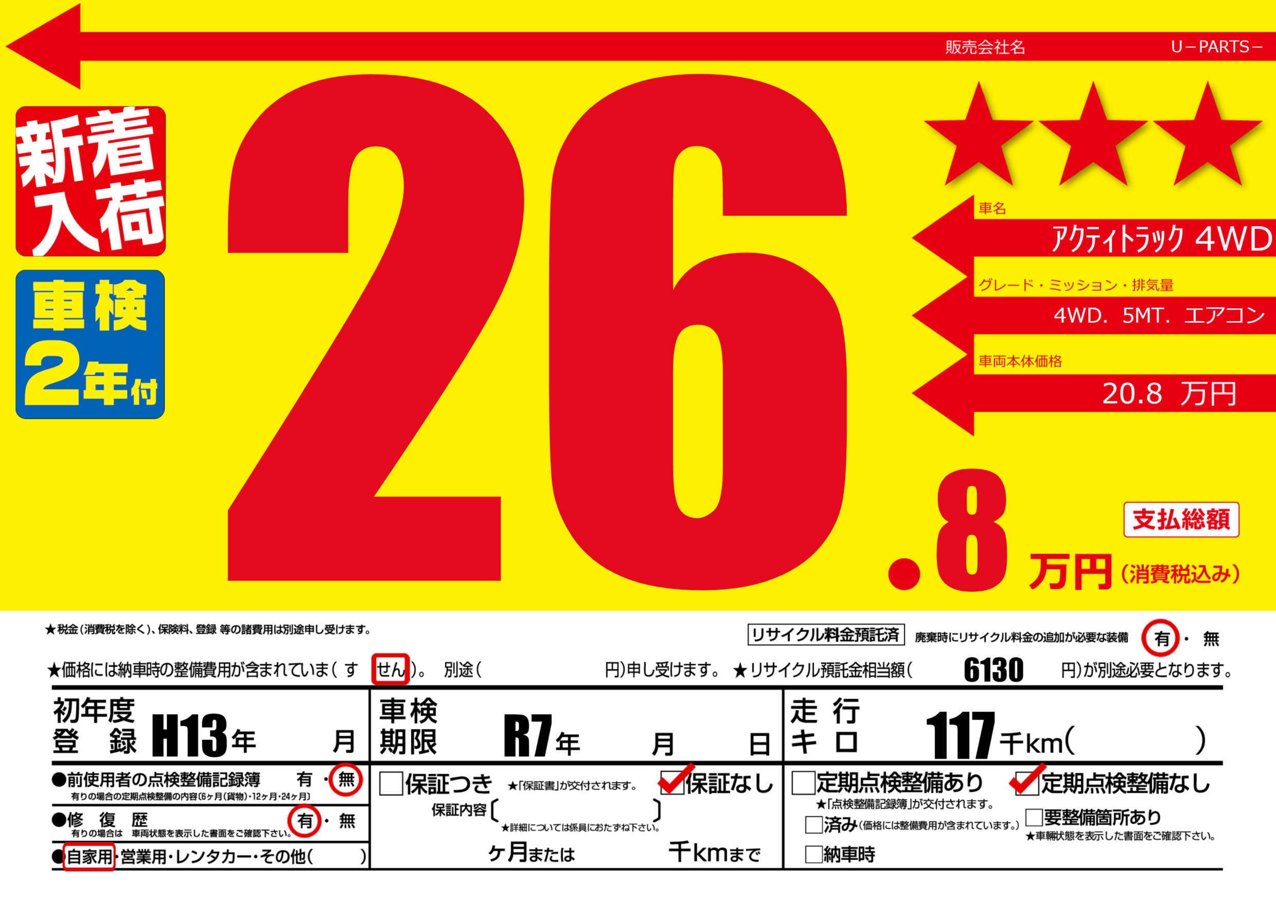 | 車名 | アクティトラック 4WD | グレード ミッション 排気量 |