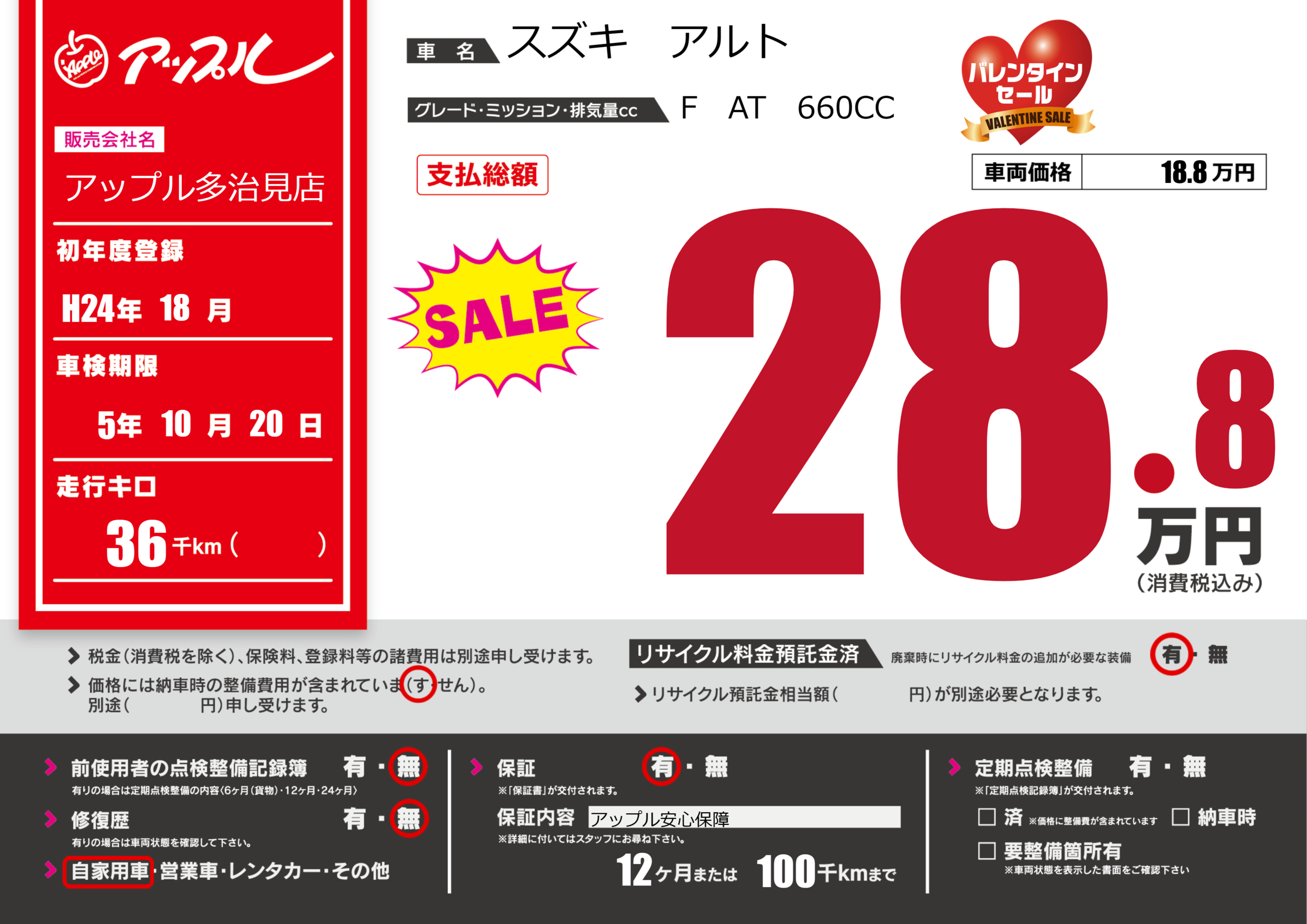 保証付き 保証内容(アップル安心保障) 12ヶ月または(100)千kmまで |