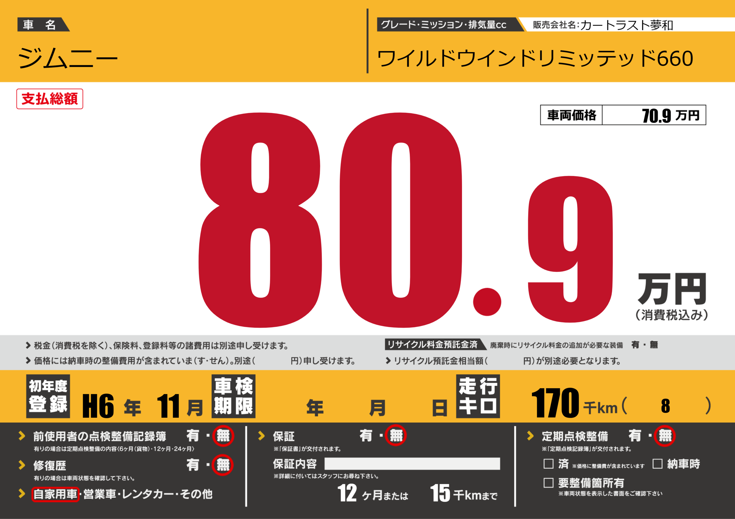 保証なし 保証内容(---) 12ヶ月または(15)千kmまで |