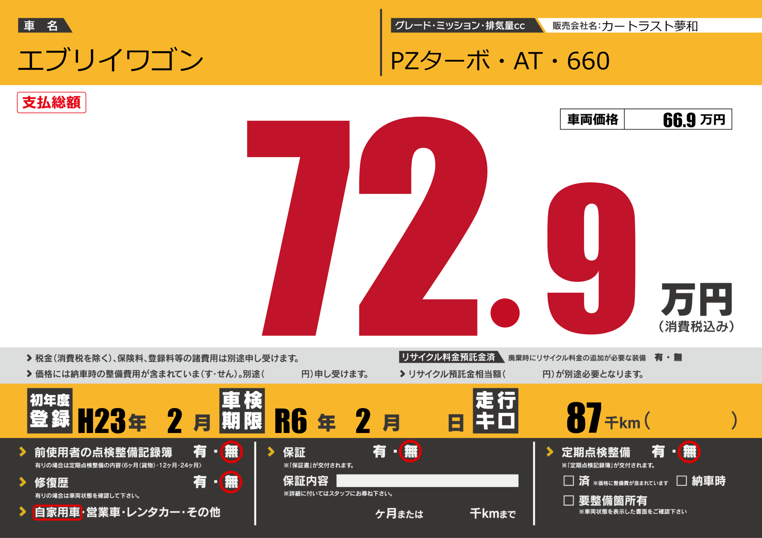 | 車名 | エブリイワゴン | グレード ミッション 排気量 |