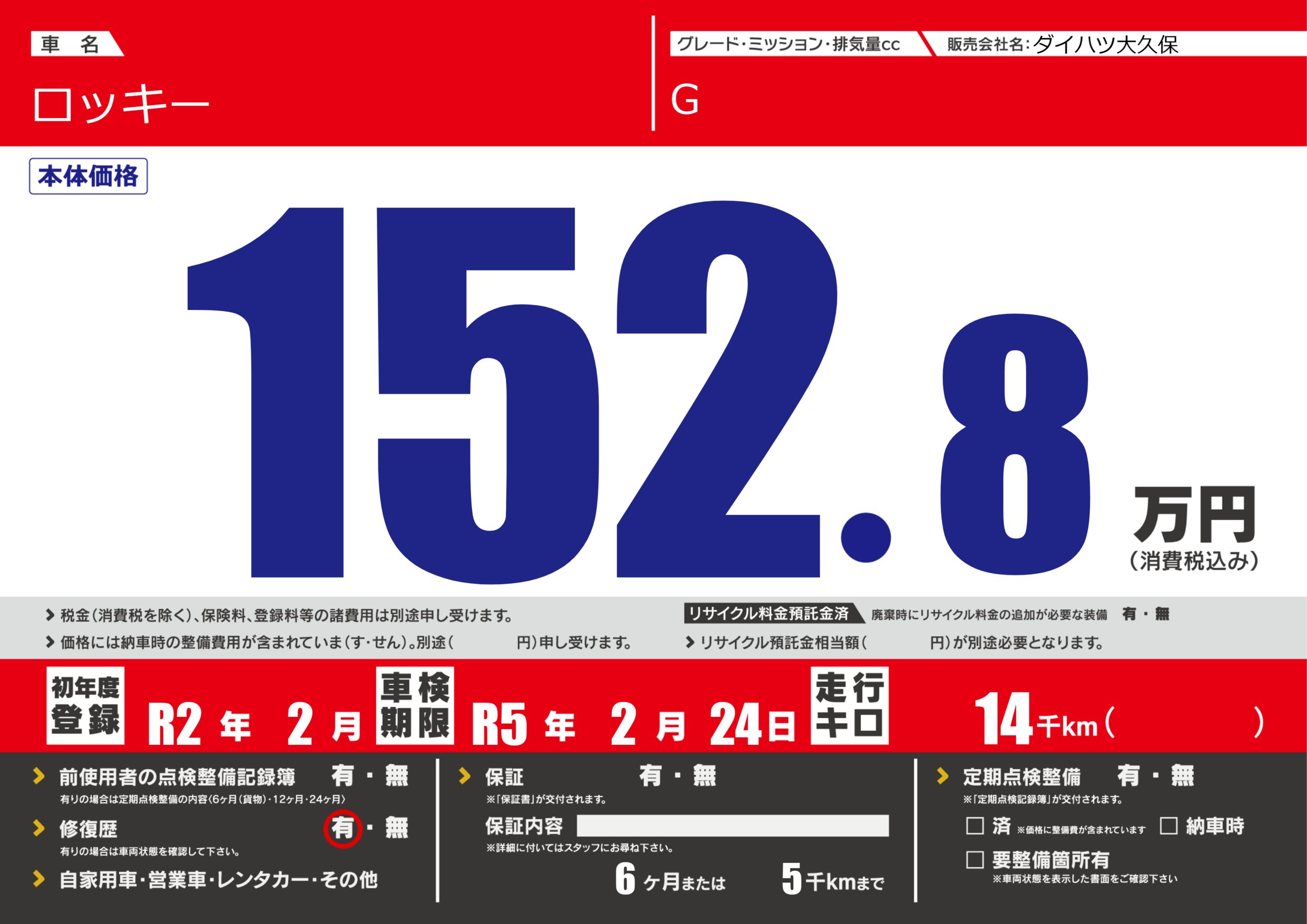 | 走行キロ | 1.4万km | 初年度登録 | R2年2月 |