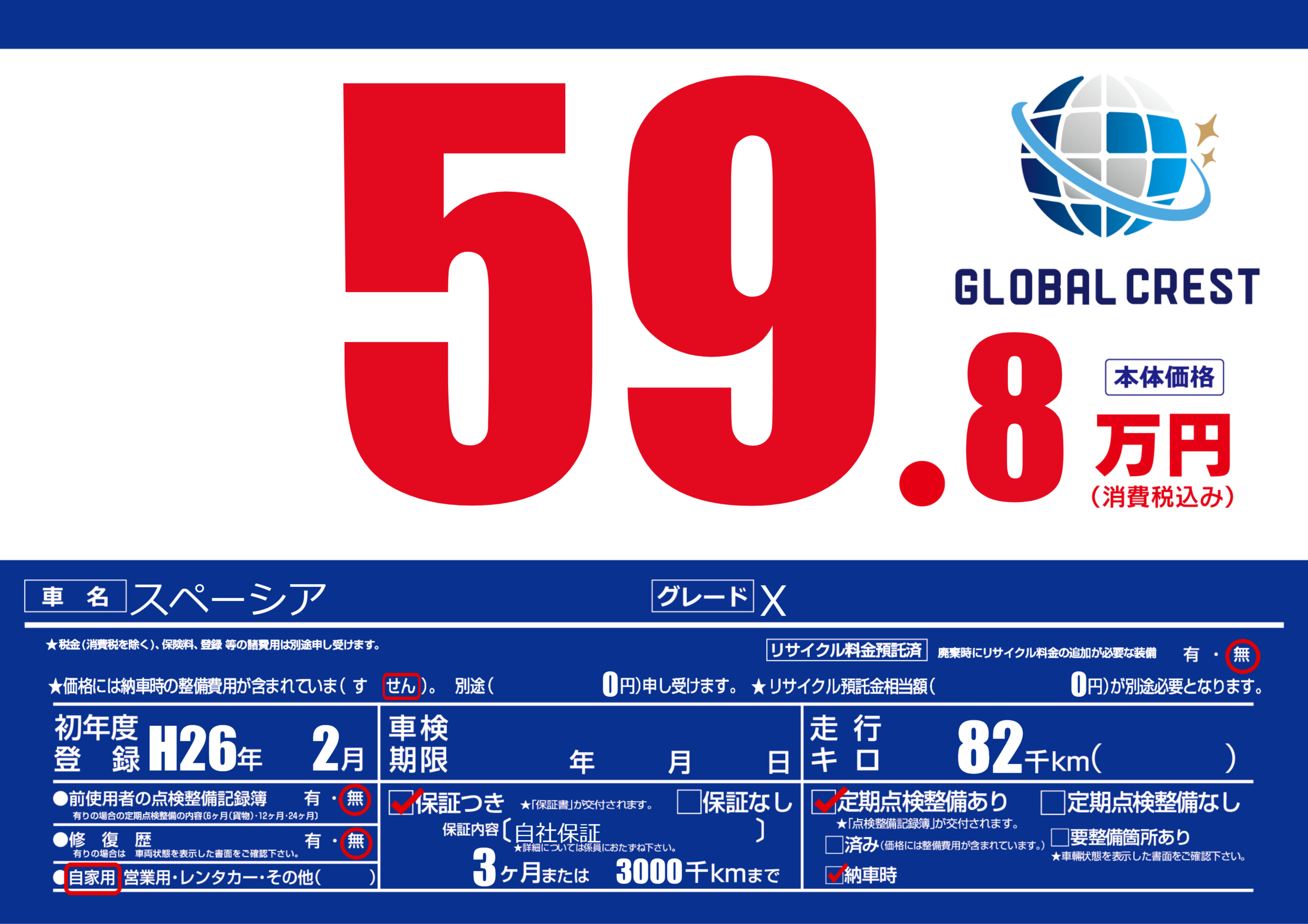 | 車名 | スペーシア | グレード ミッション 排気量 |