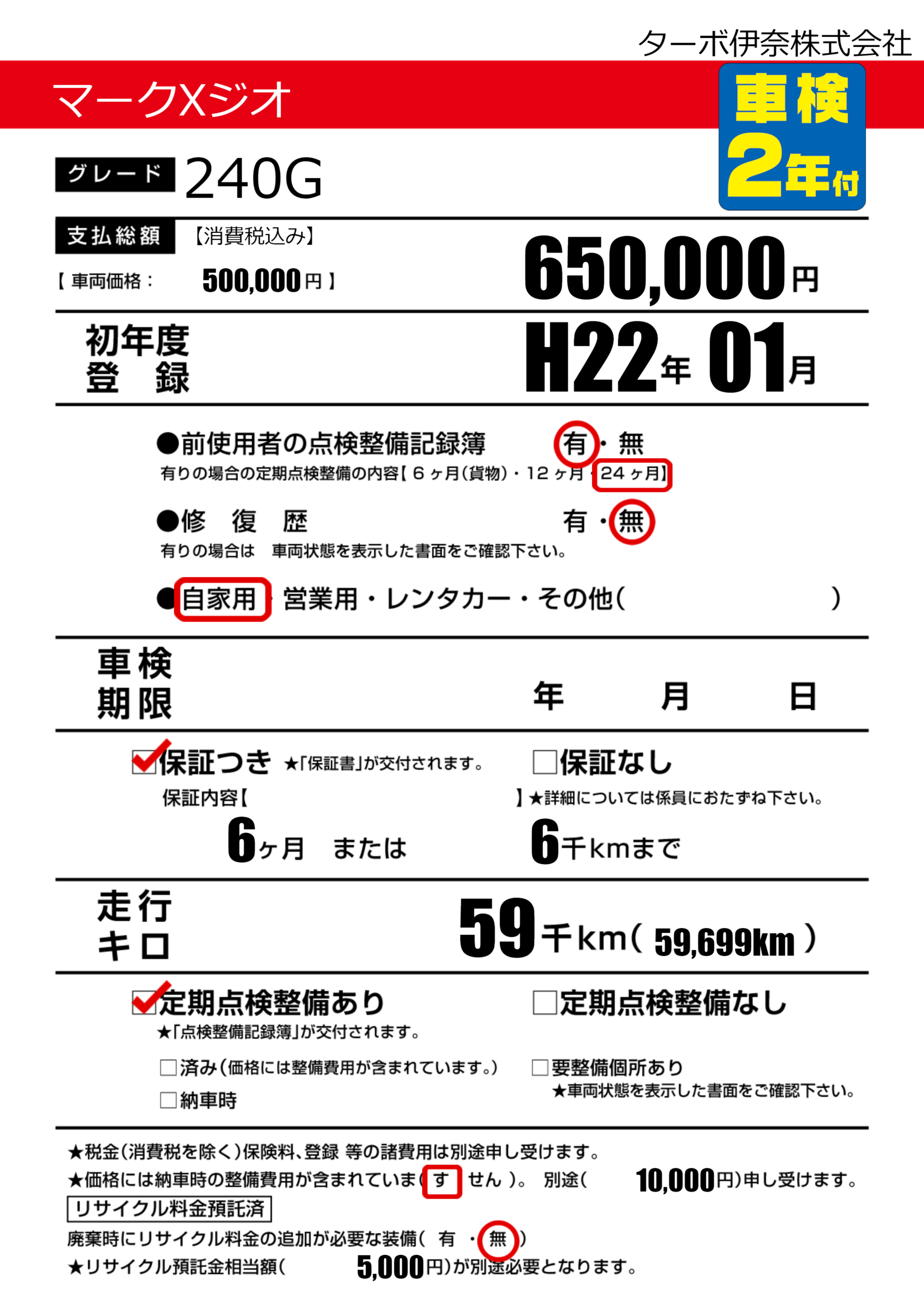| 走行キロ | 5.9万km | 初年度登録 | H22年01月 |
