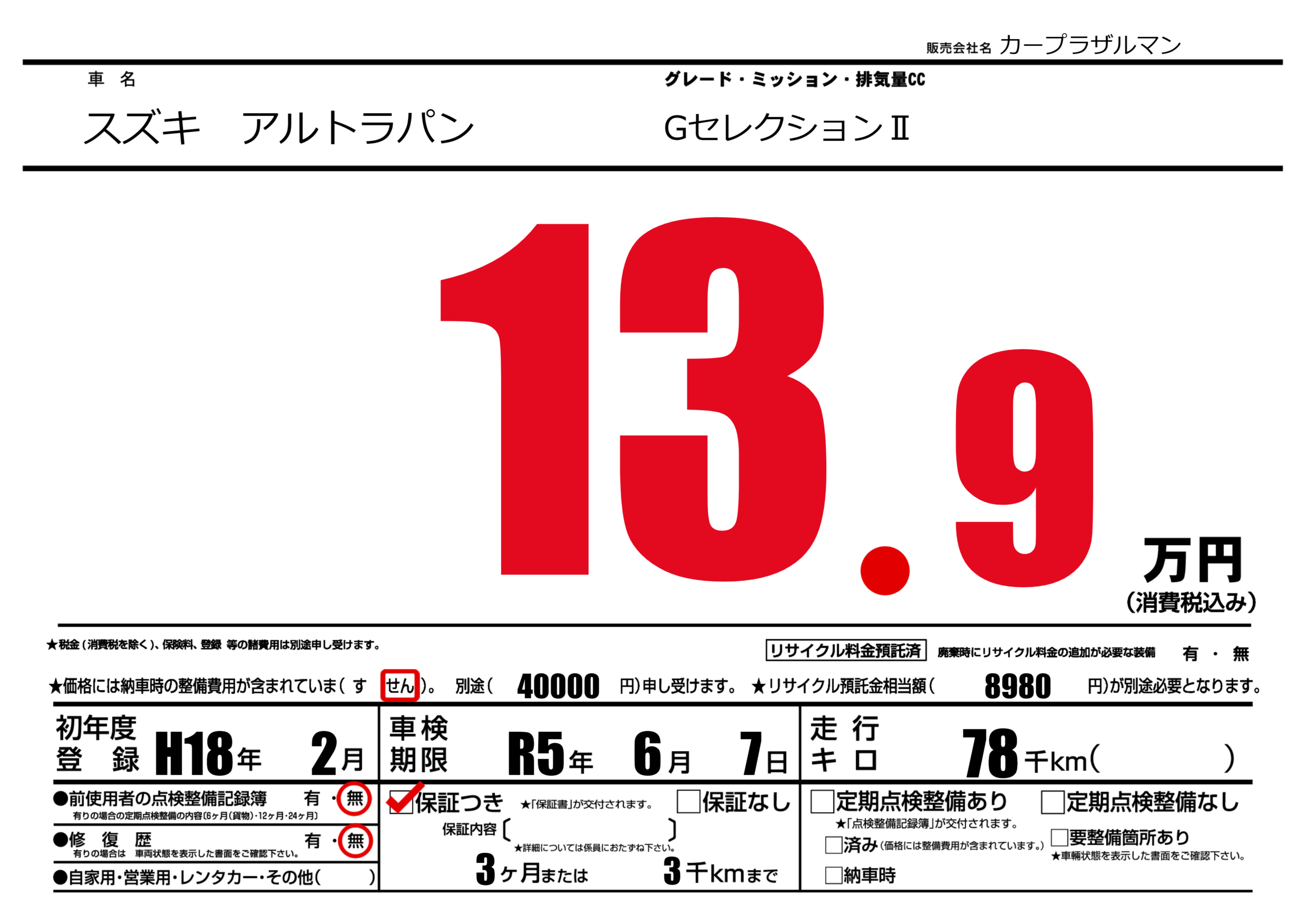 保証付き 保証内容(---) 3ヶ月または(3)千kmまで |
