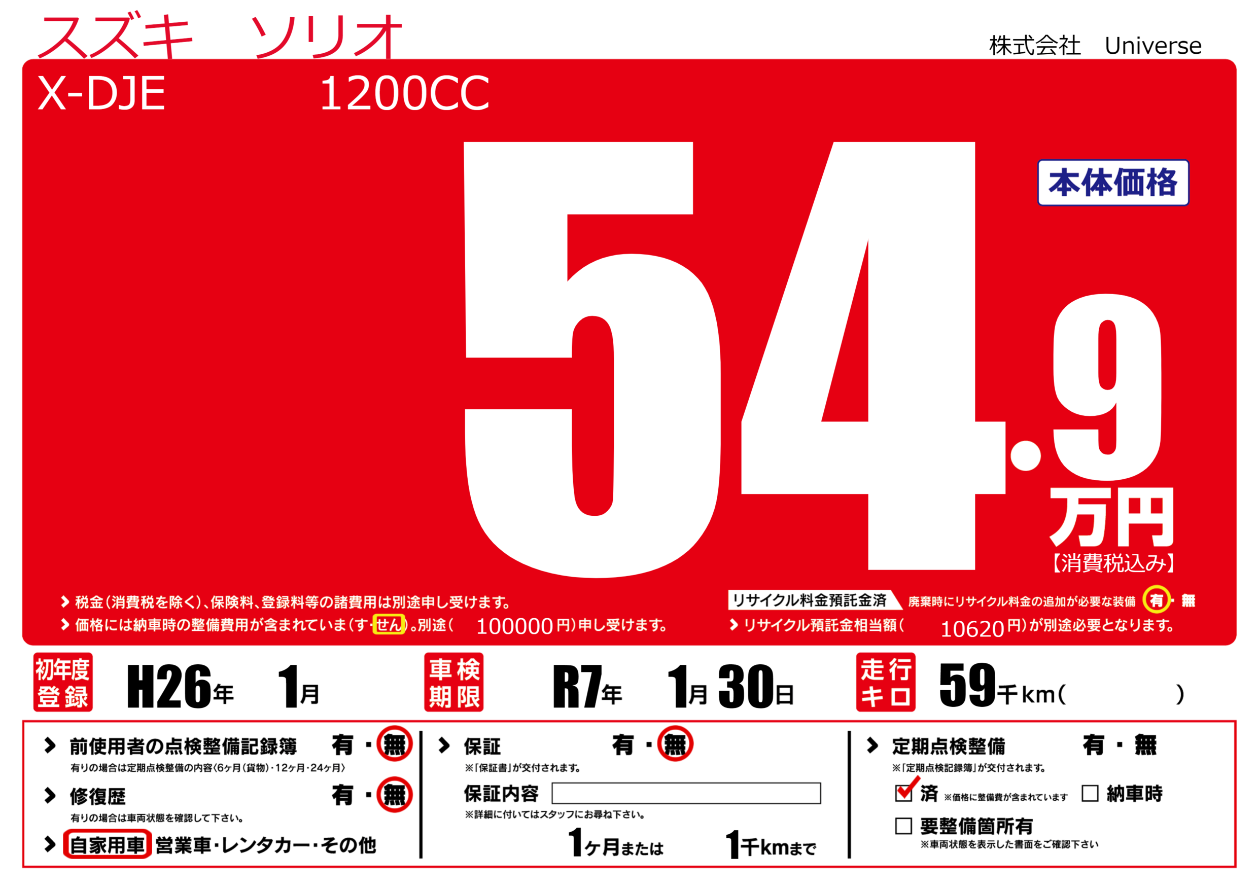 | 車名 | スズキ ソリオ | グレード ミッション 排気量 |