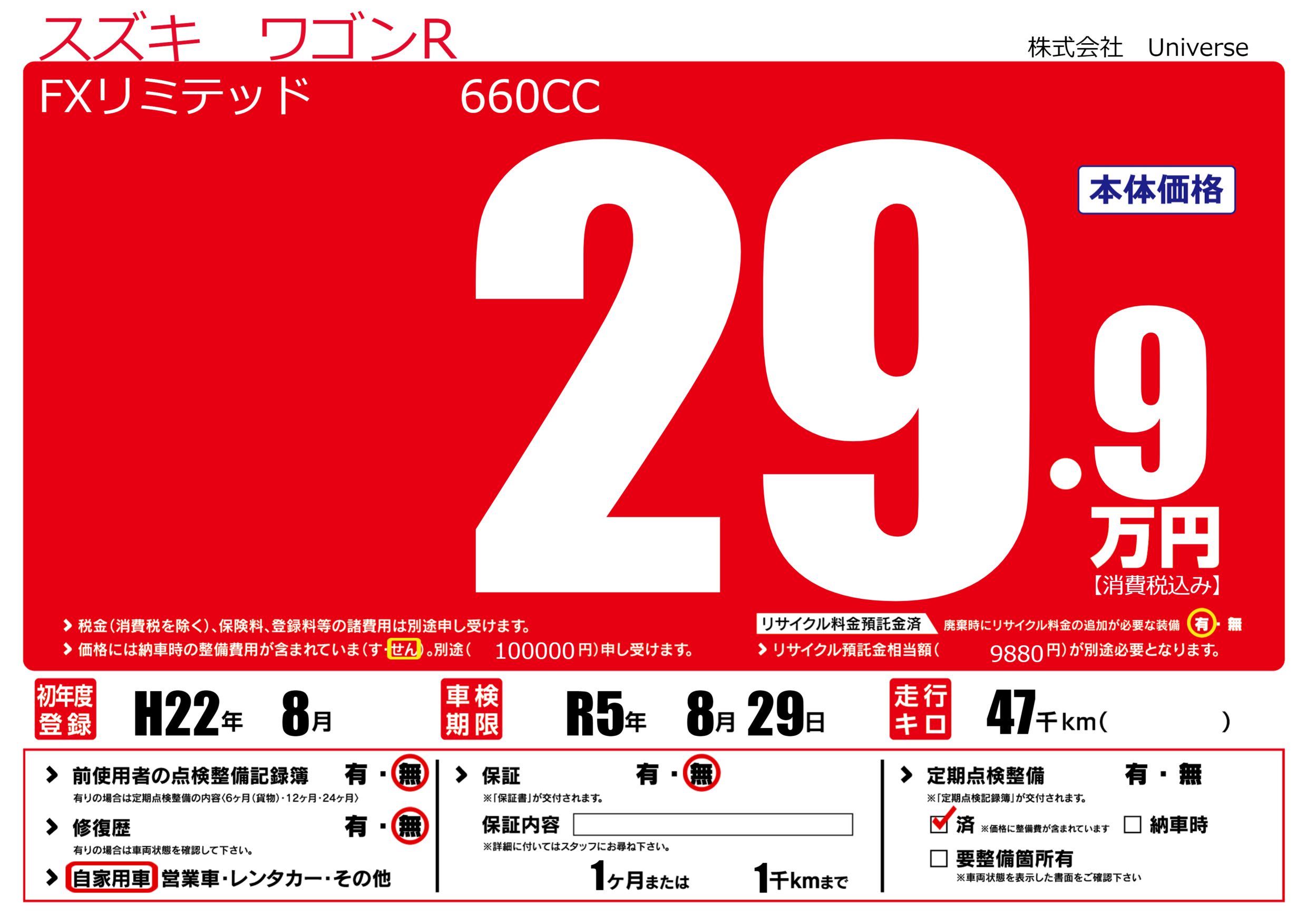 | 走行キロ | 4.7万km | 初年度登録 | H22年8月 |