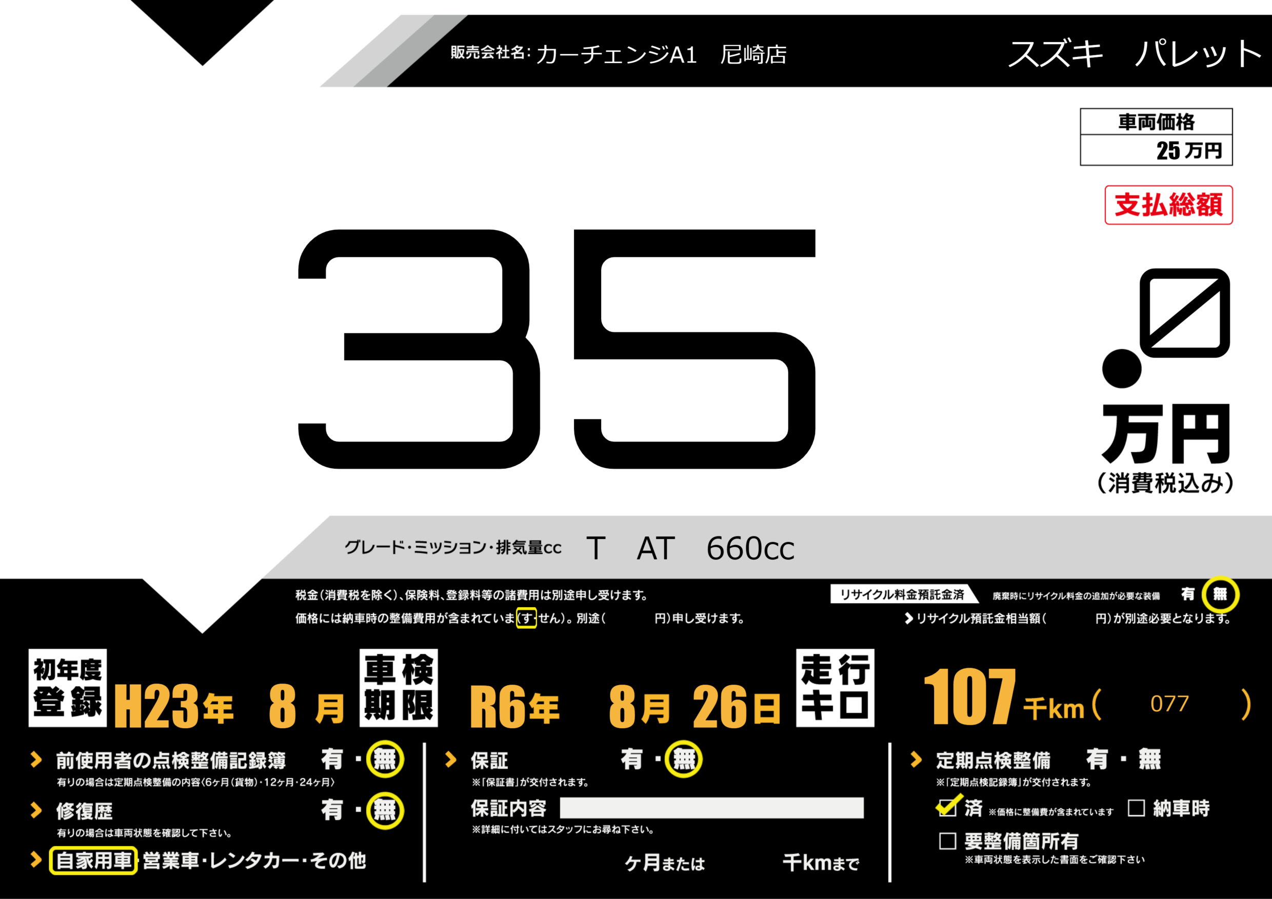 | 走行キロ | 10.7万km | 初年度登録 | H23年8月 |