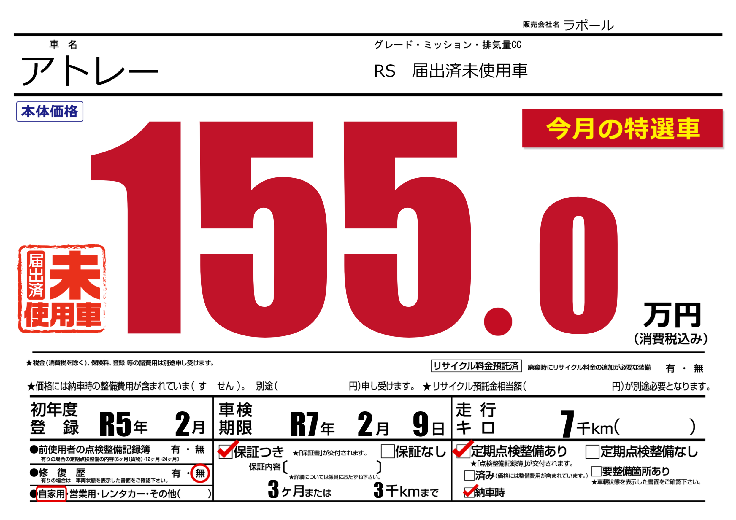| 走行キロ | 0.7万km | 初年度登録 | R5年2月 |