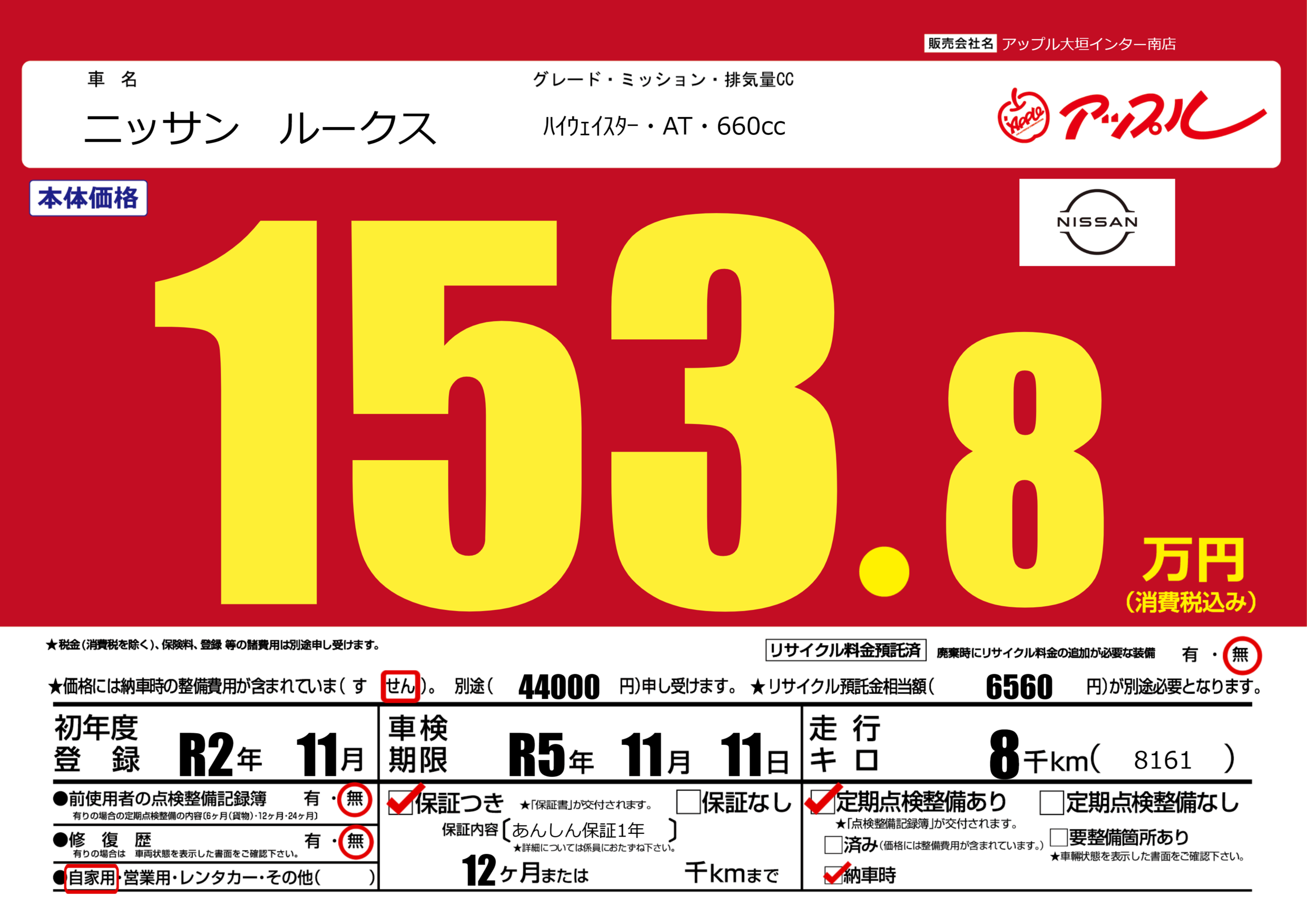 | 車名 | ニッサン ルークス | グレード ミッション 排気量 |