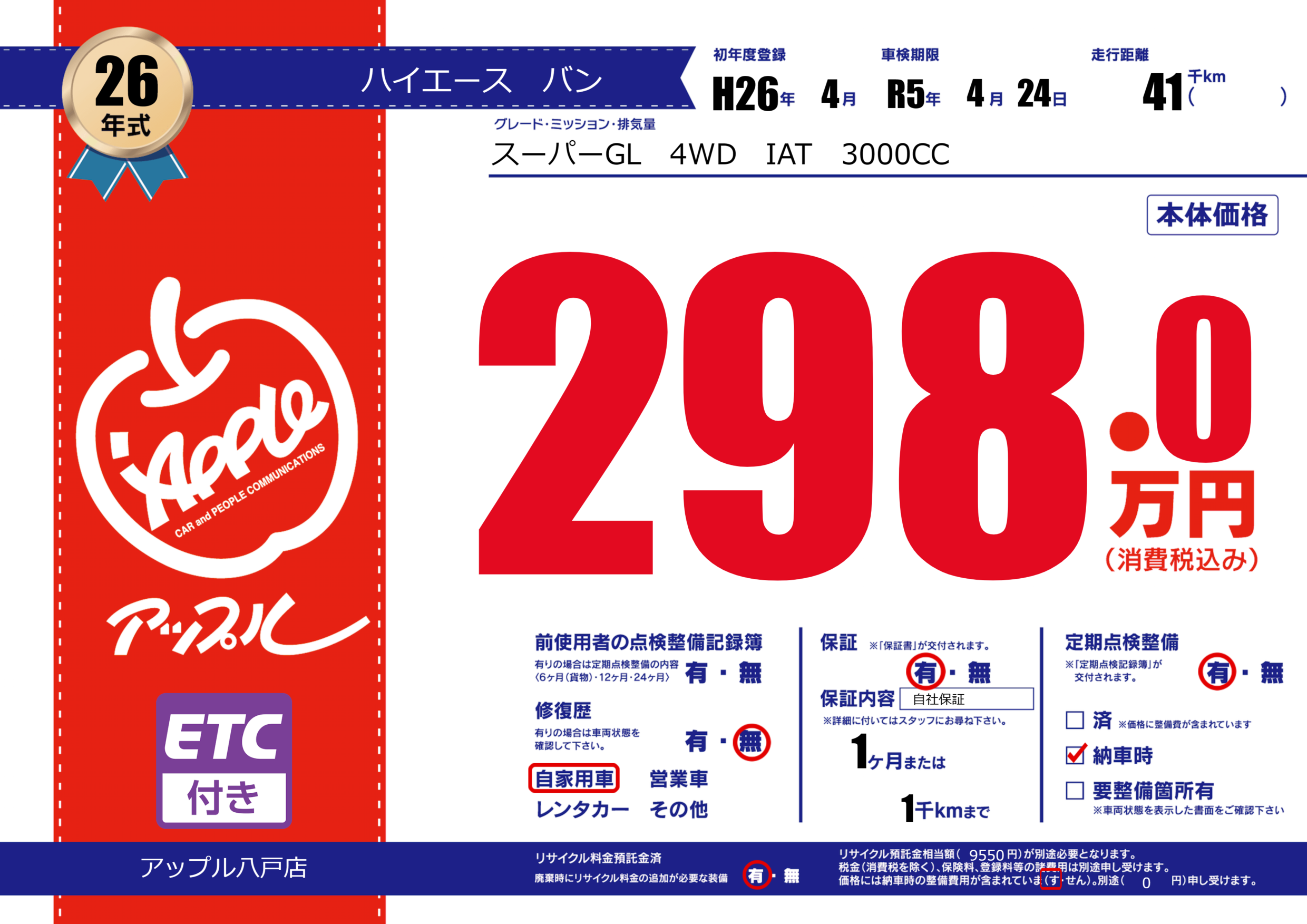 | 走行キロ | 4.1万km | 初年度登録 | H26年4月 |