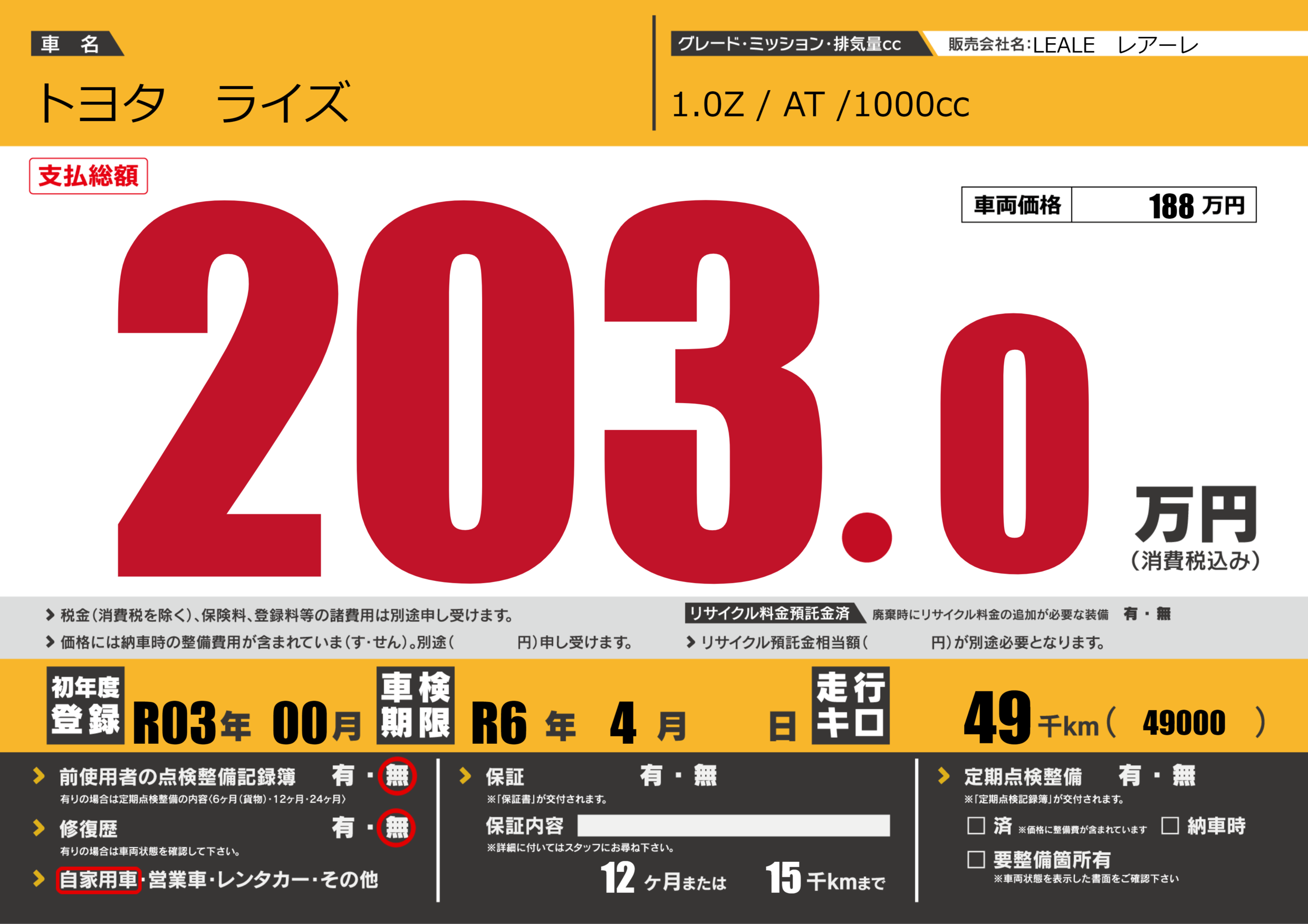 | 走行キロ | 4.9万km | 初年度登録 | R03年00月 |