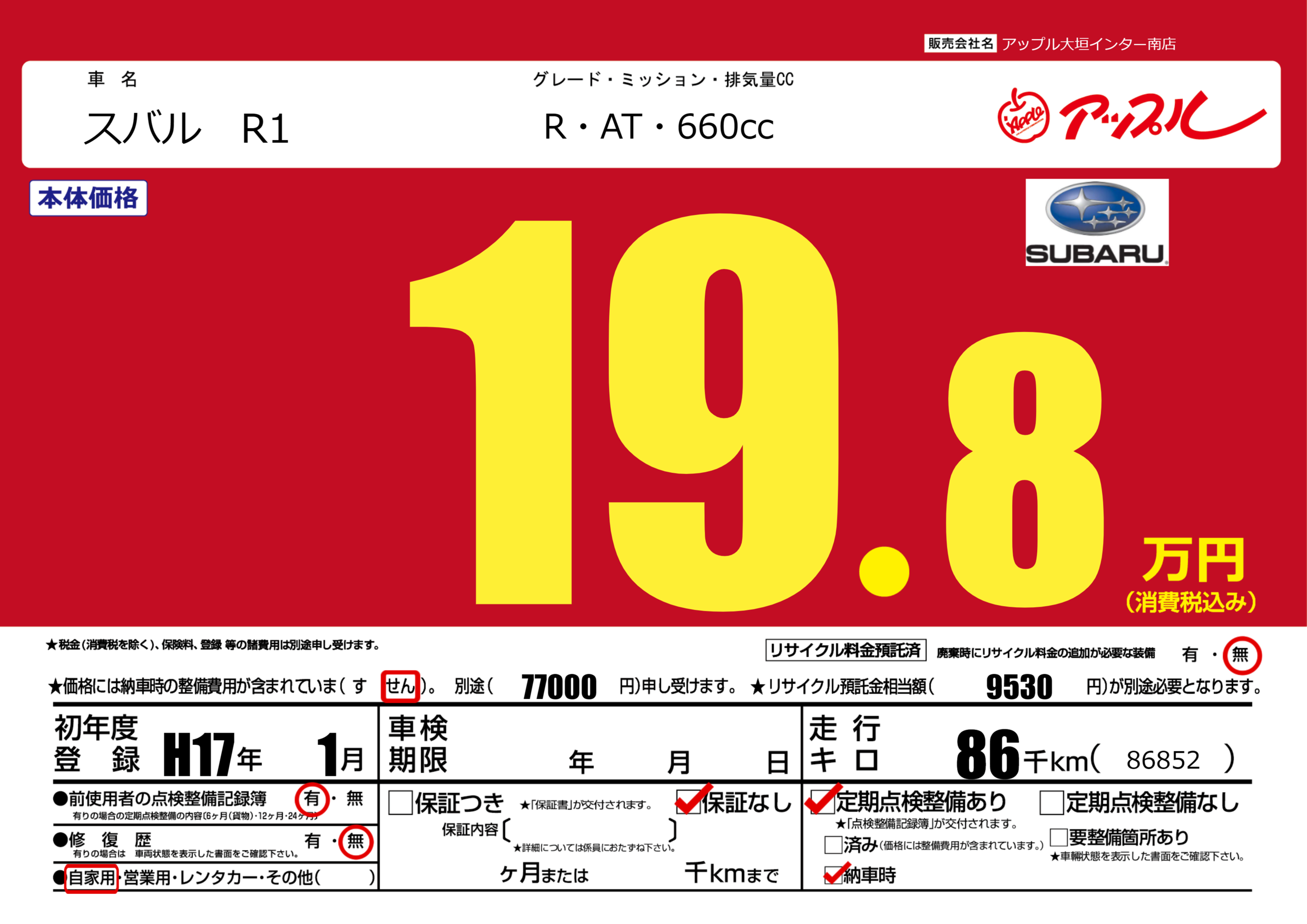 | 車名 | スバル R1 | グレード ミッション 排気量 |