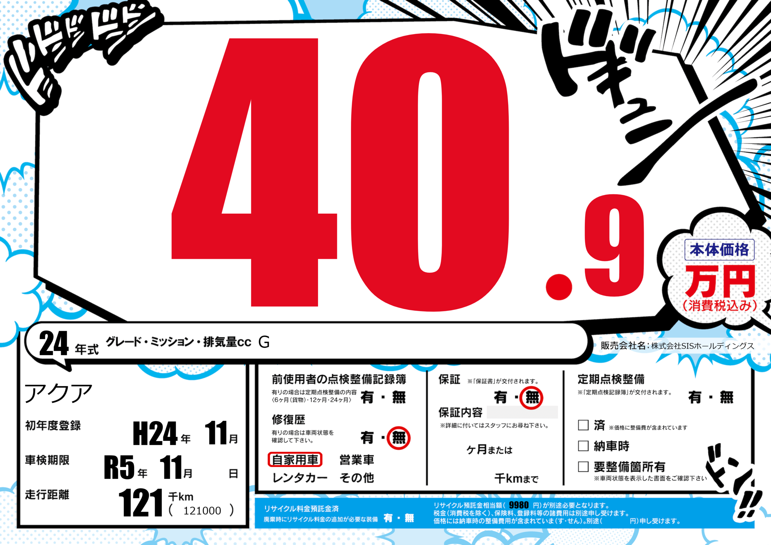 | 走行キロ | 12.1万km | 初年度登録 | H24年11月 |