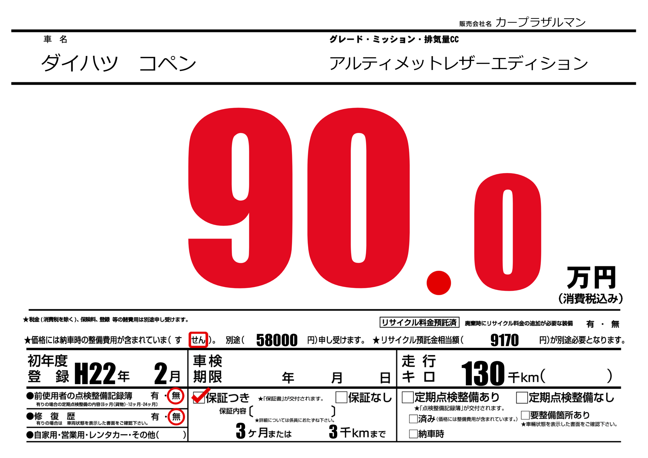 | 車名 | ダイハツ コペン | グレード ミッション 排気量 |