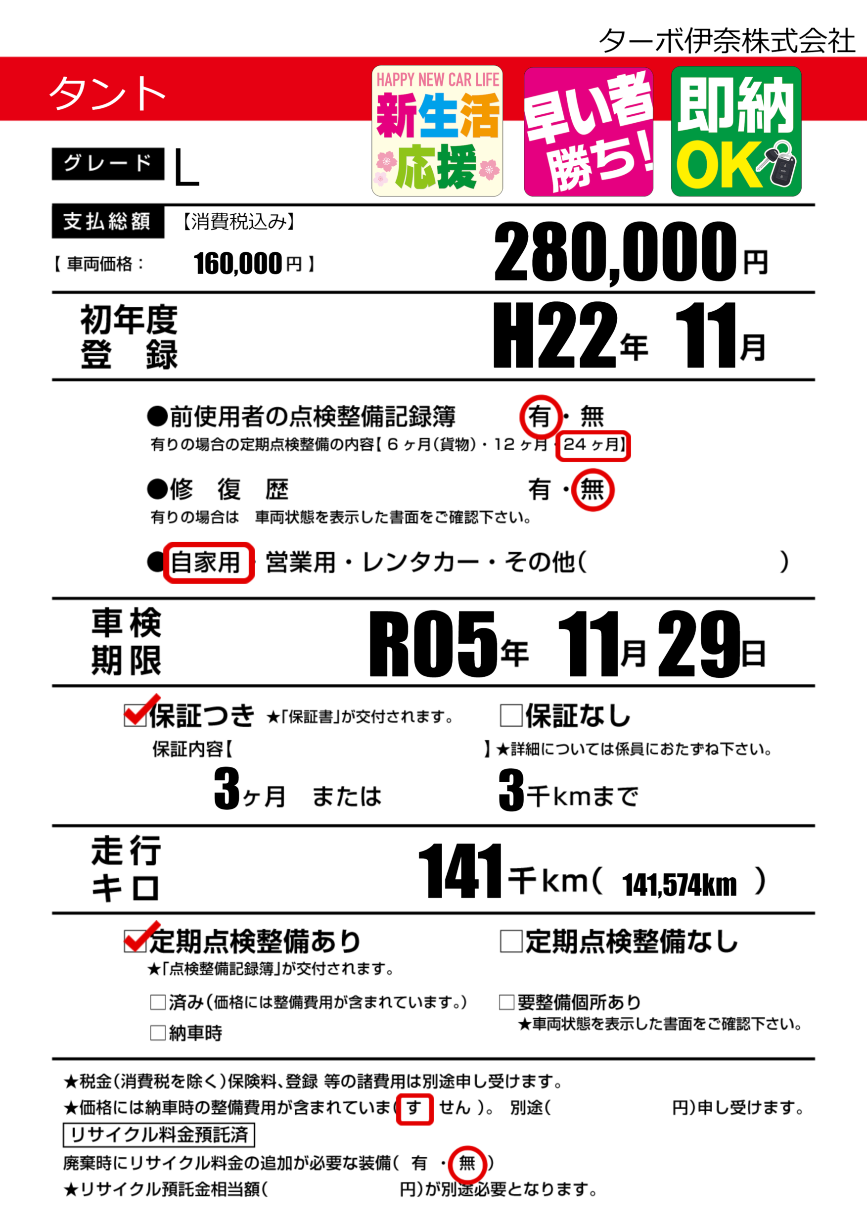 保証付き 保証内容(---) 3ヶ月または(3)千kmまで |