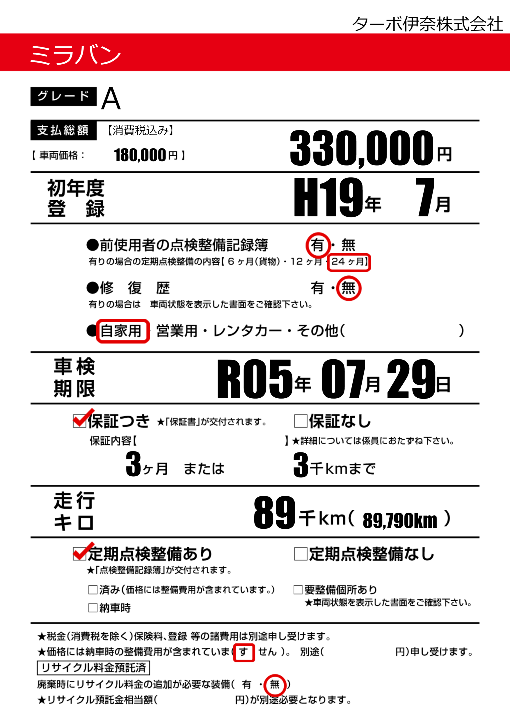 | 定期点検整備 | 定期点検整備あり | ||