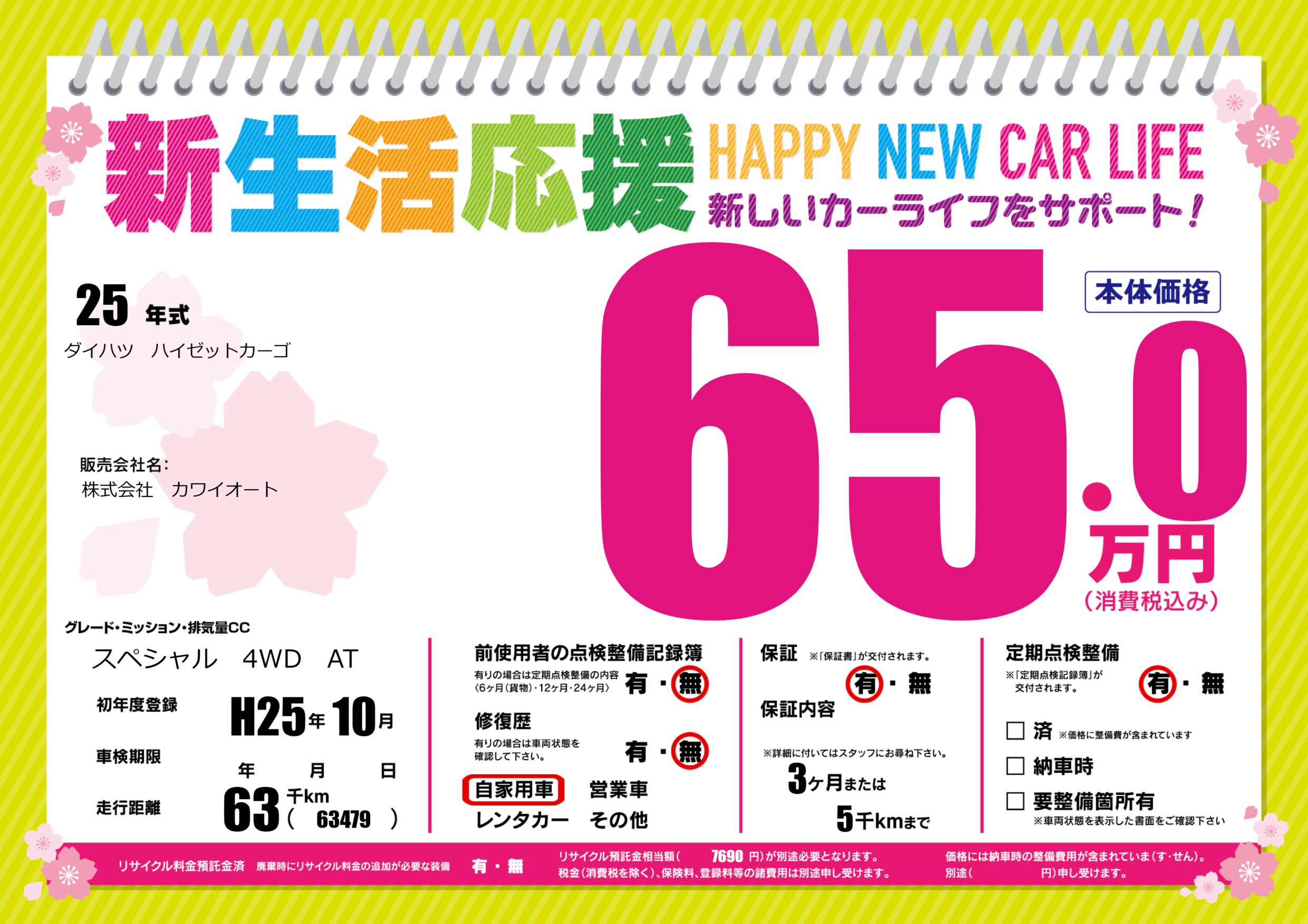| 車名 | ダイハツ ハイゼットカーゴ | グレード ミッション 排気量 |