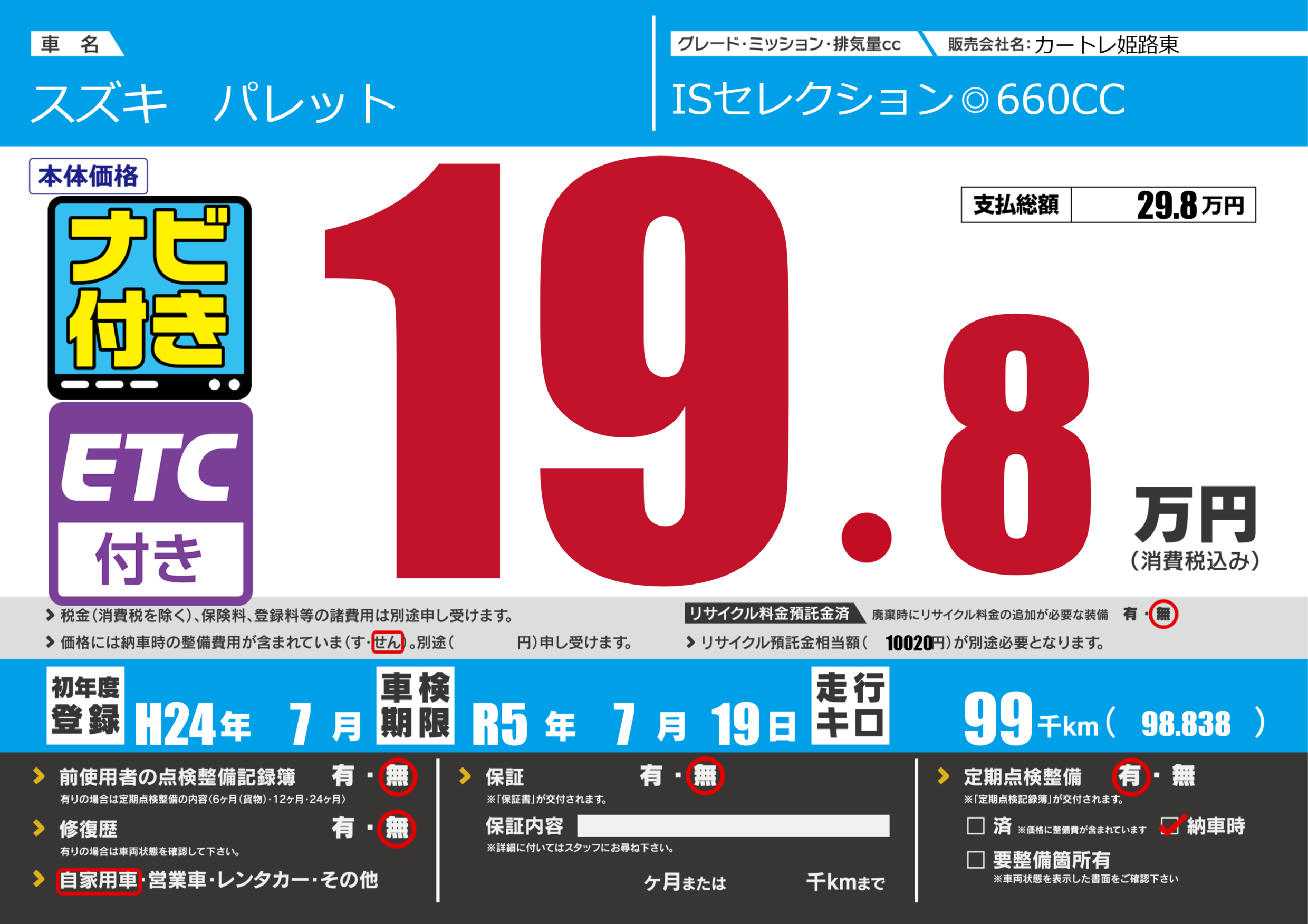 | 定期点検整備 | 定期点検整備あり 納車時あり | ||