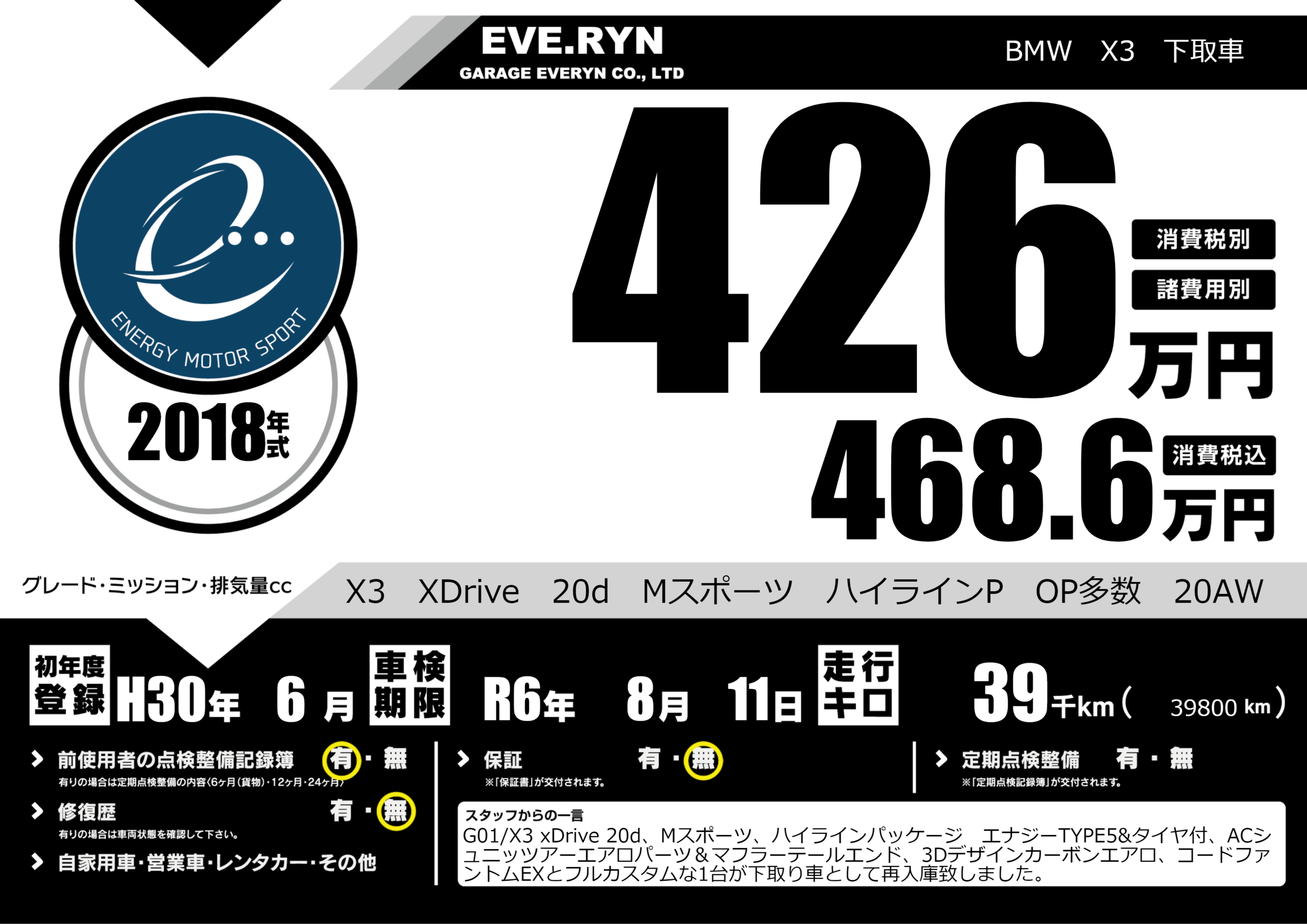 | 車名 | BMW X3 下取車 | グレード ミッション 排気量 |
