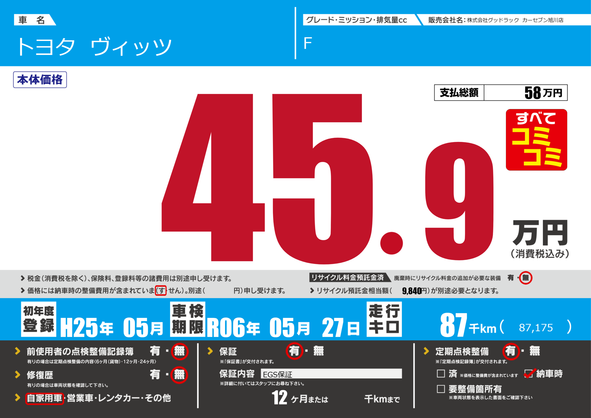 | 走行キロ | 8.7万km | 初年度登録 | H25年05月 |