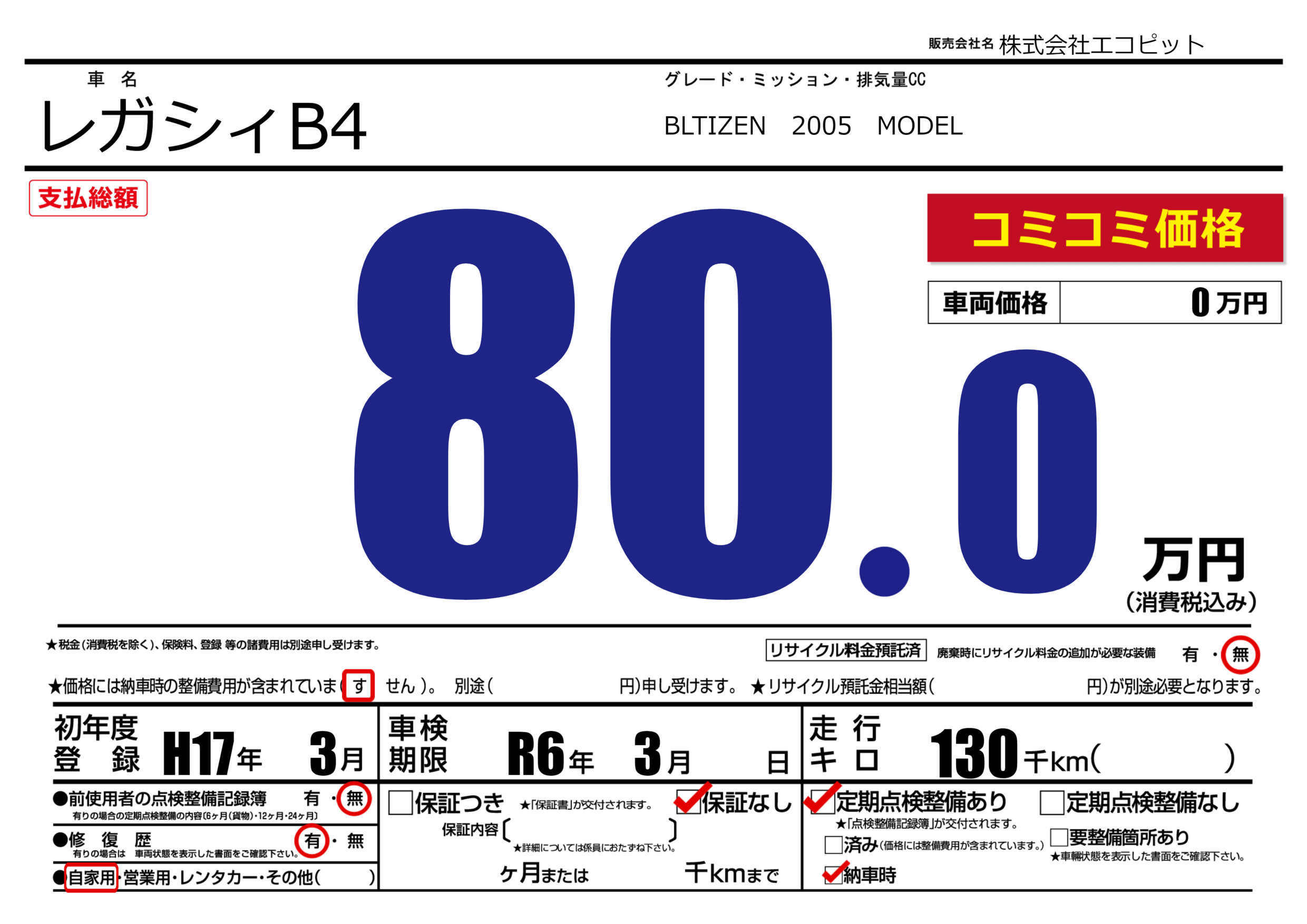 | 車検制限 | R6年 3月 - 日 | ||