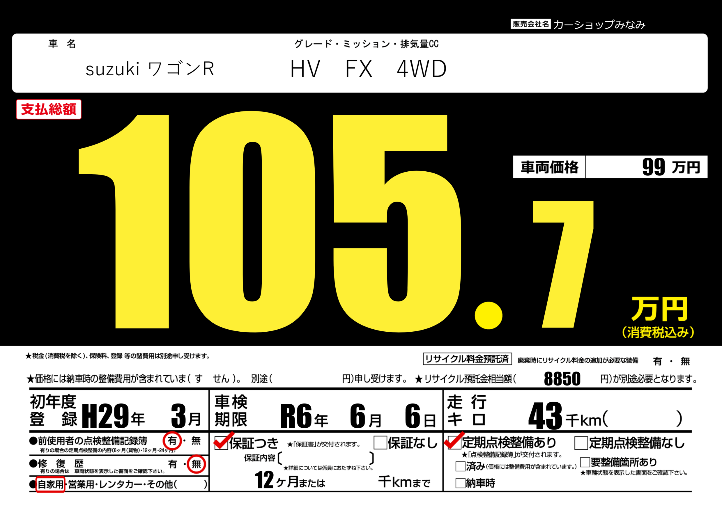 | 車名 | suzuki ワゴンR | グレード ミッション 排気量 |