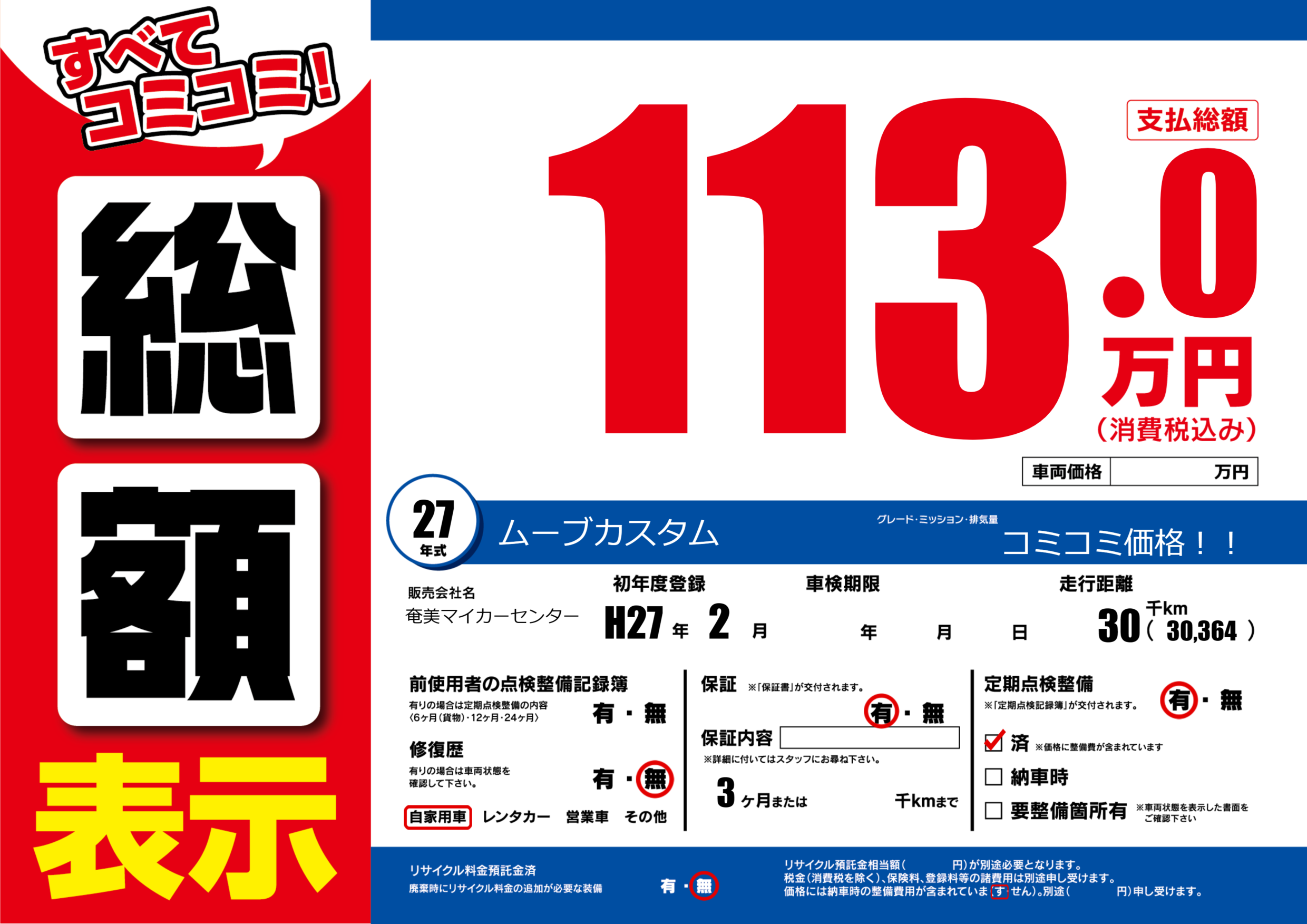 | 定期点検整備 | 定期点検整備あり 定期点検整備済み | ||