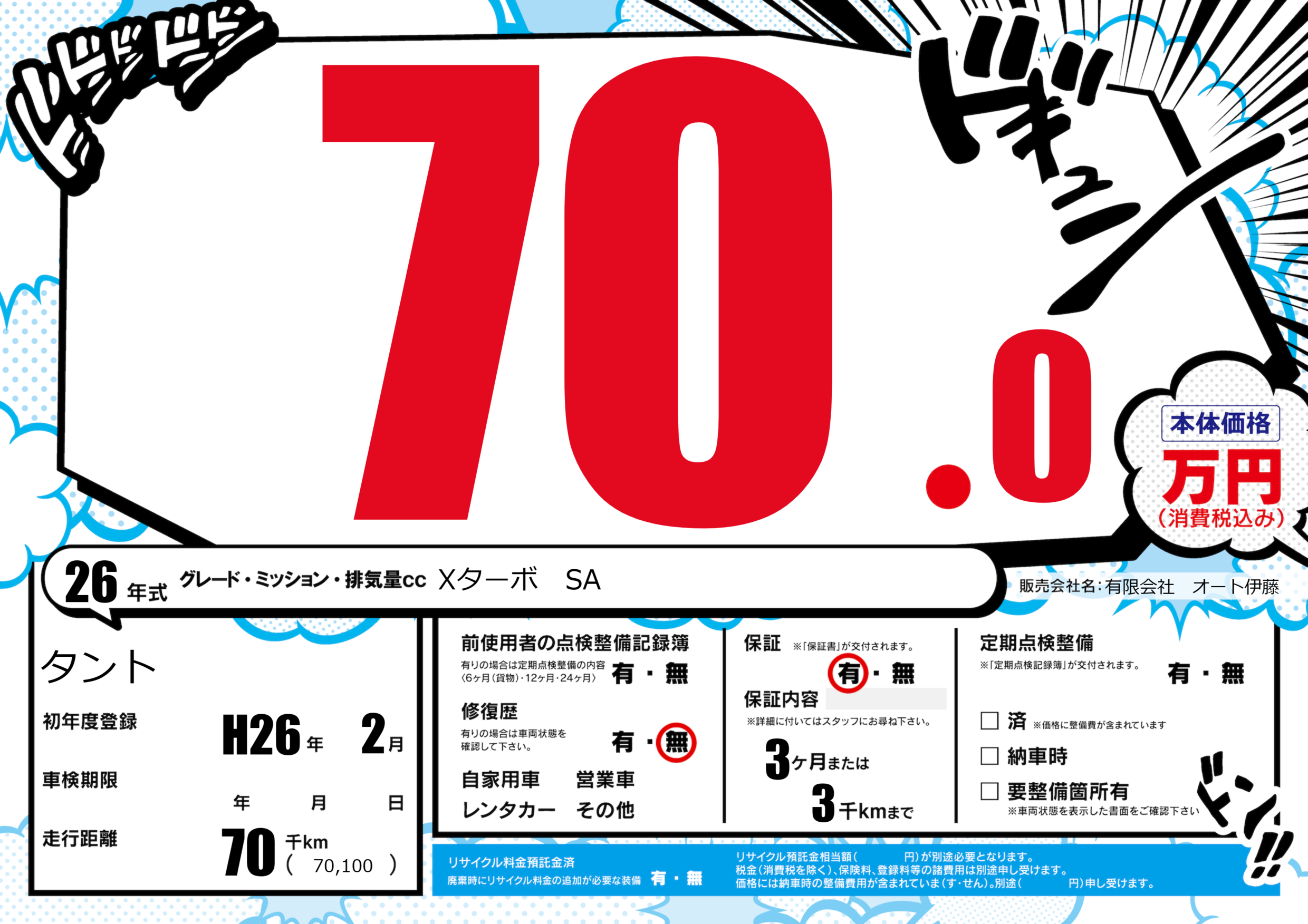 | 走行キロ | 7万km | 初年度登録 | H26年2月 |