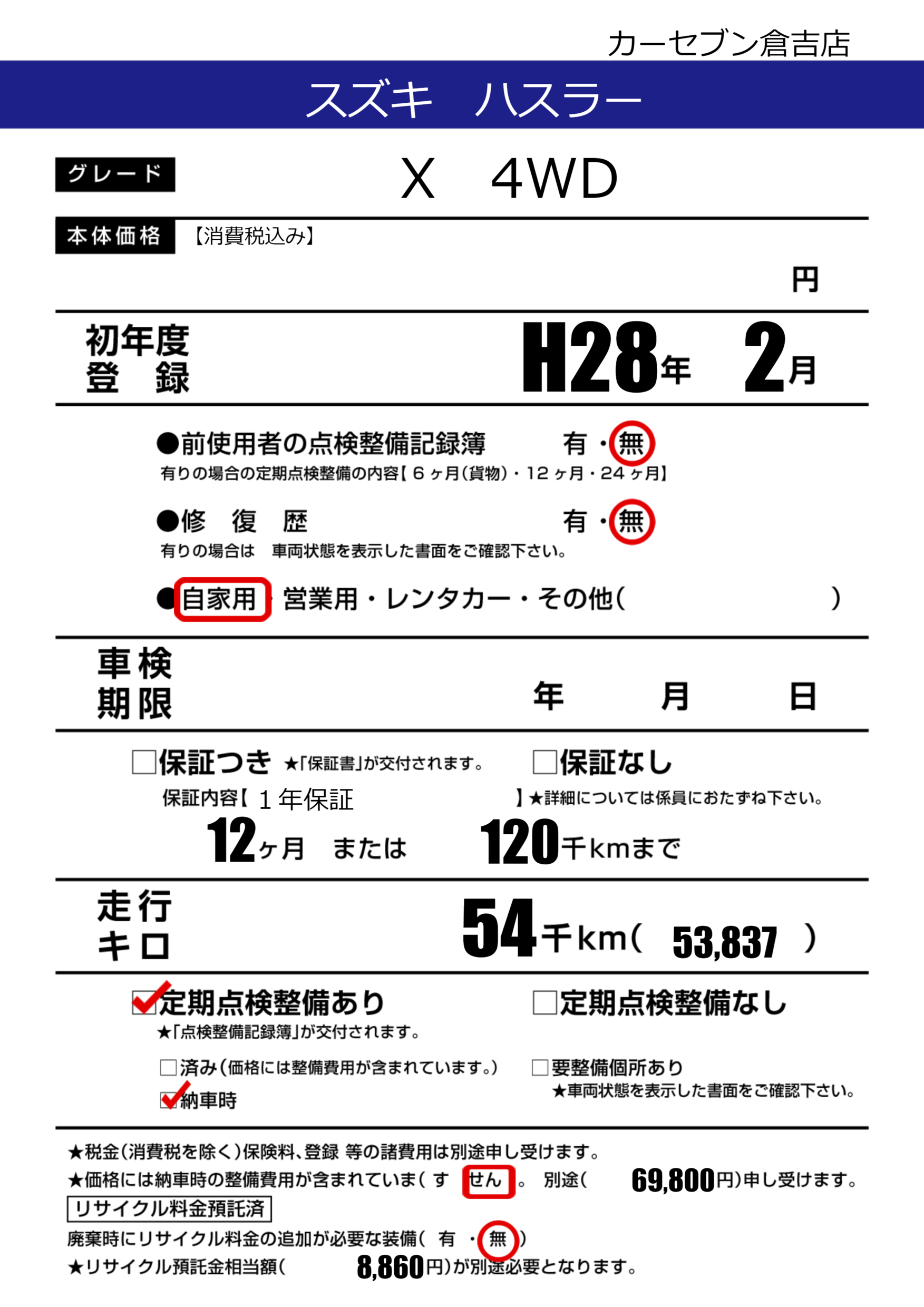 | 車名 | スズキ ハスラー | グレード ミッション 排気量 |
