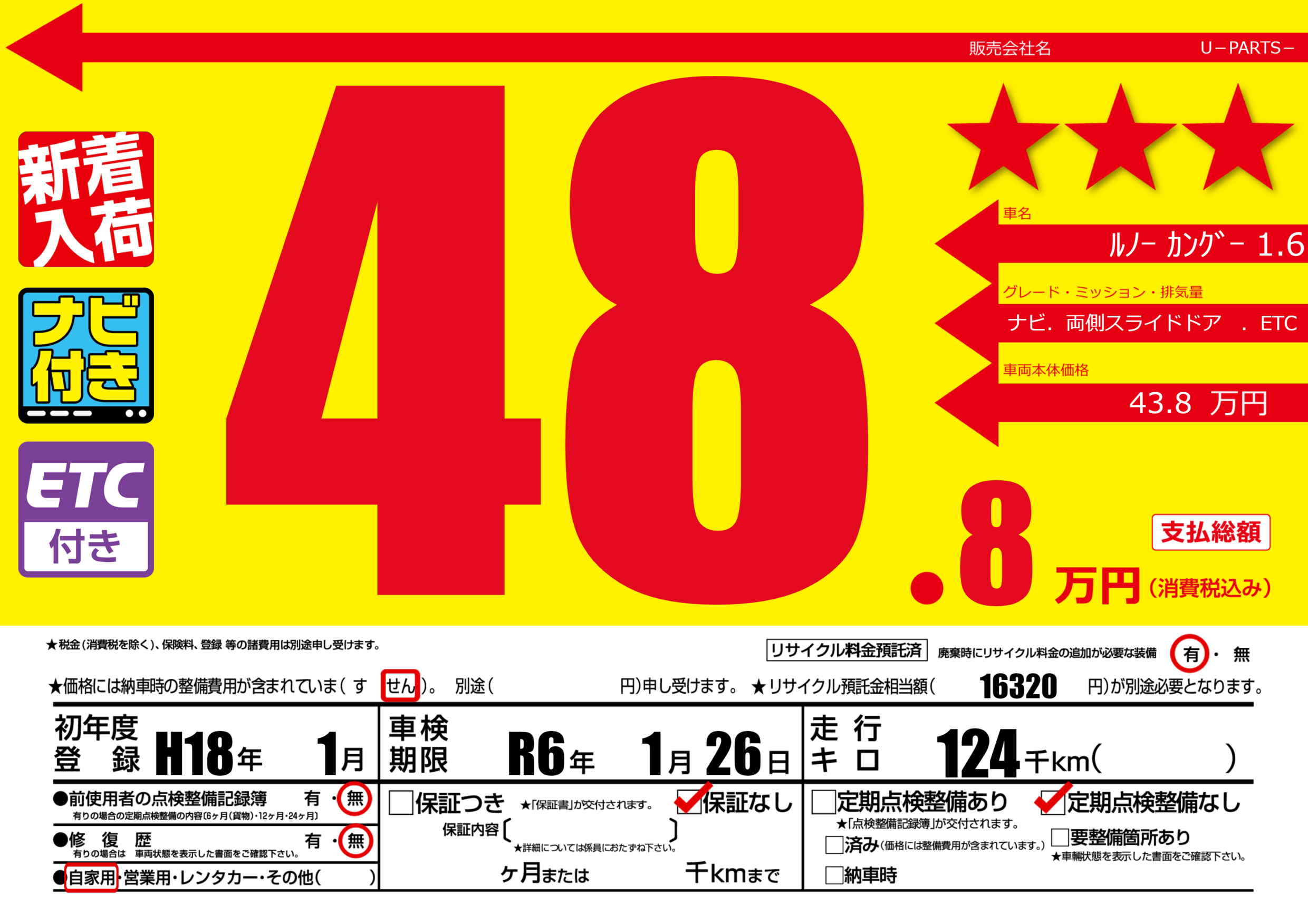 | 走行キロ | 12.4万km | 初年度登録 | H18年1月 |