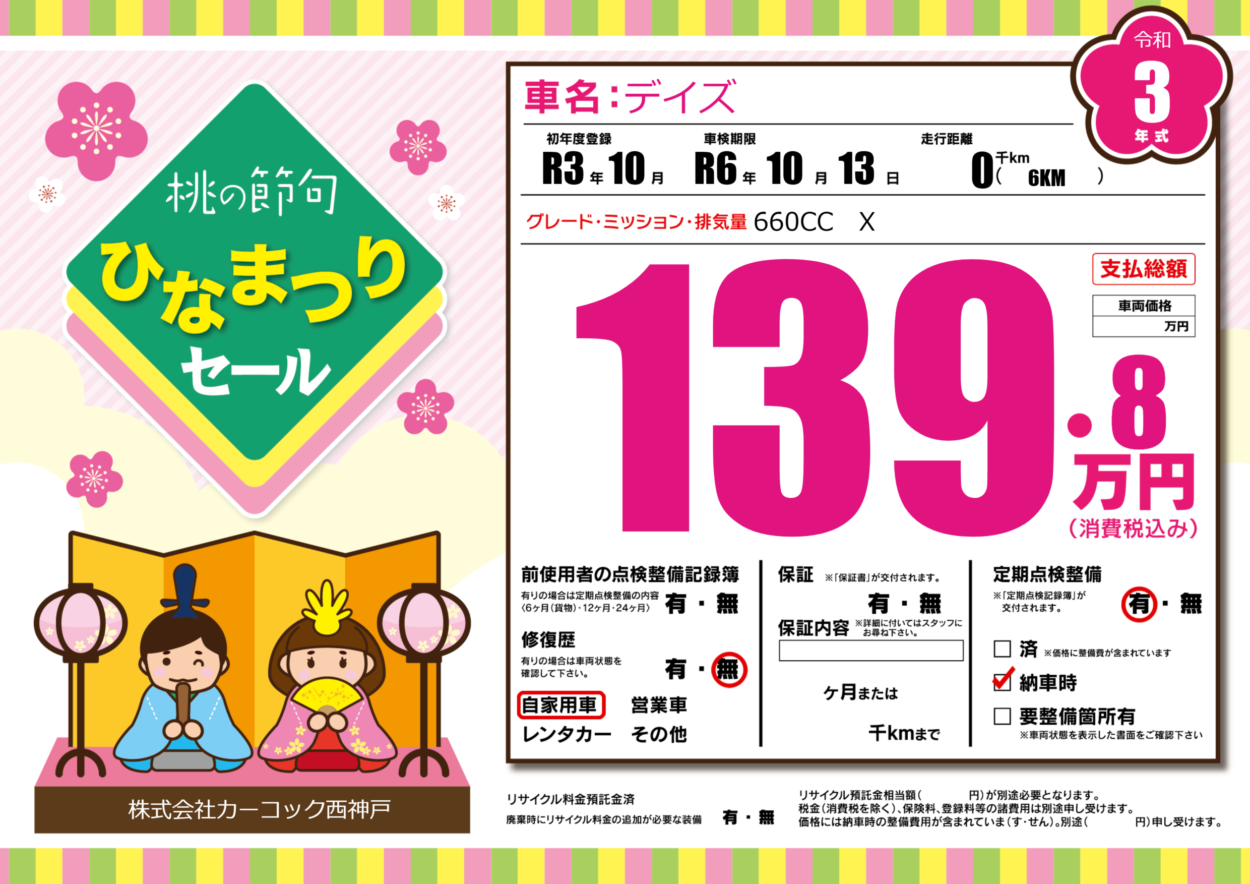 | 定期点検整備 | 定期点検整備あり 納車時あり | ||
