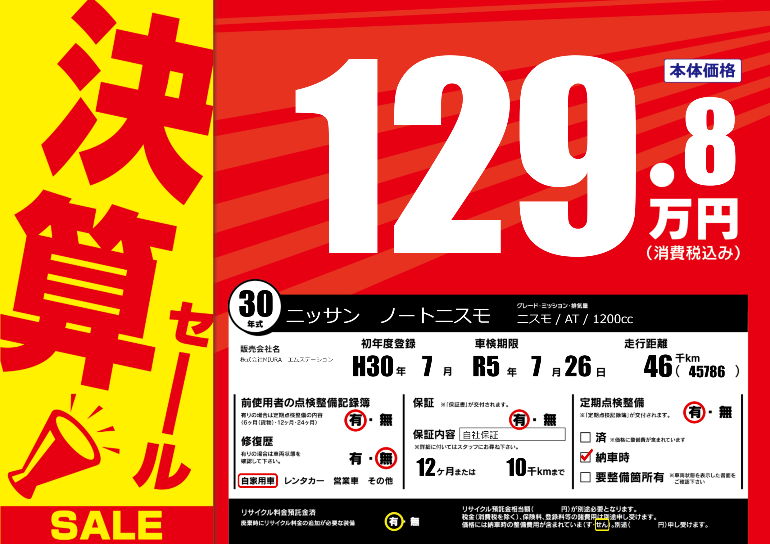 保証付き 保証内容(自社保証) 12ヶ月または(10)千kmまで |