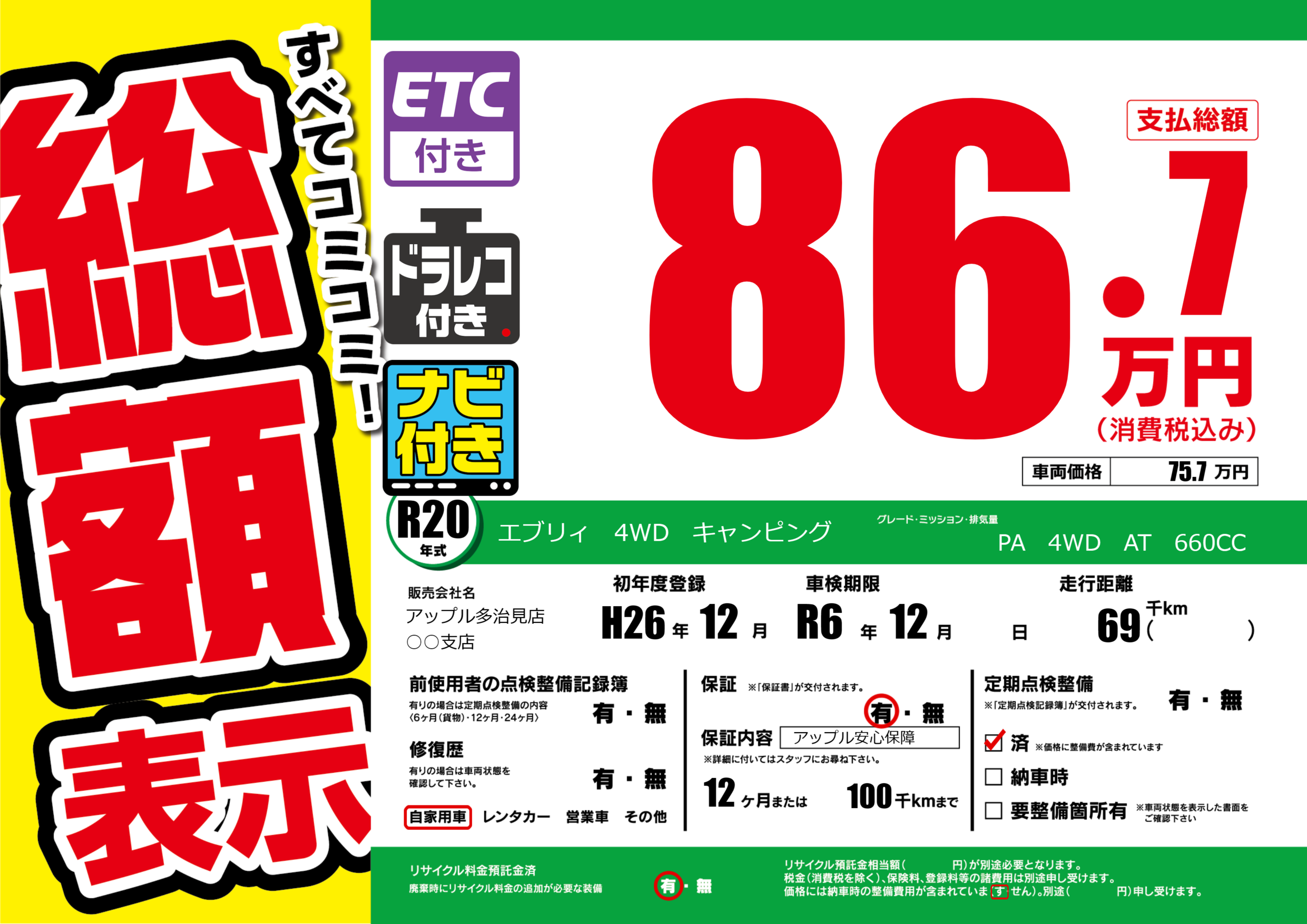 保証付き 保証内容(アップル安心保障) 12ヶ月または(100)千kmまで |